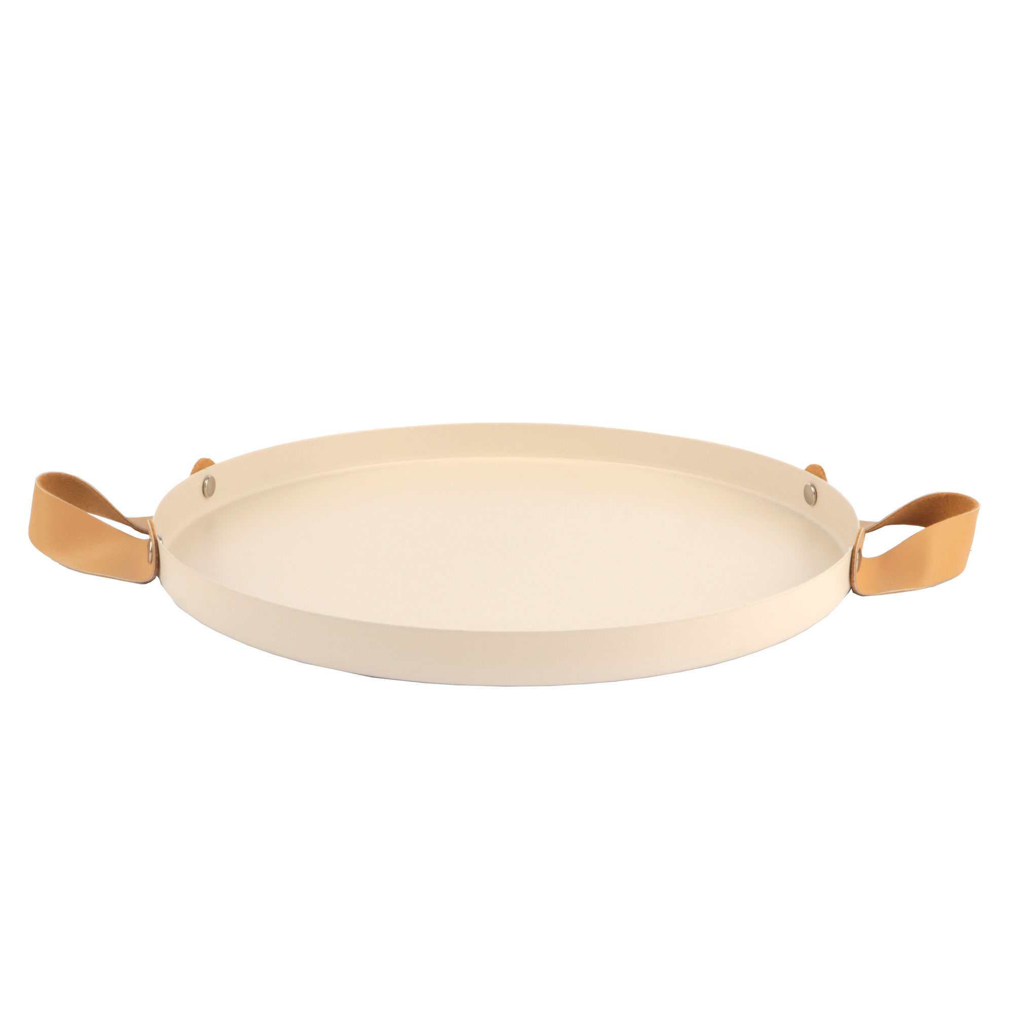 Dienblad metaal rond 25x2 cm beige met bruinleren grepen