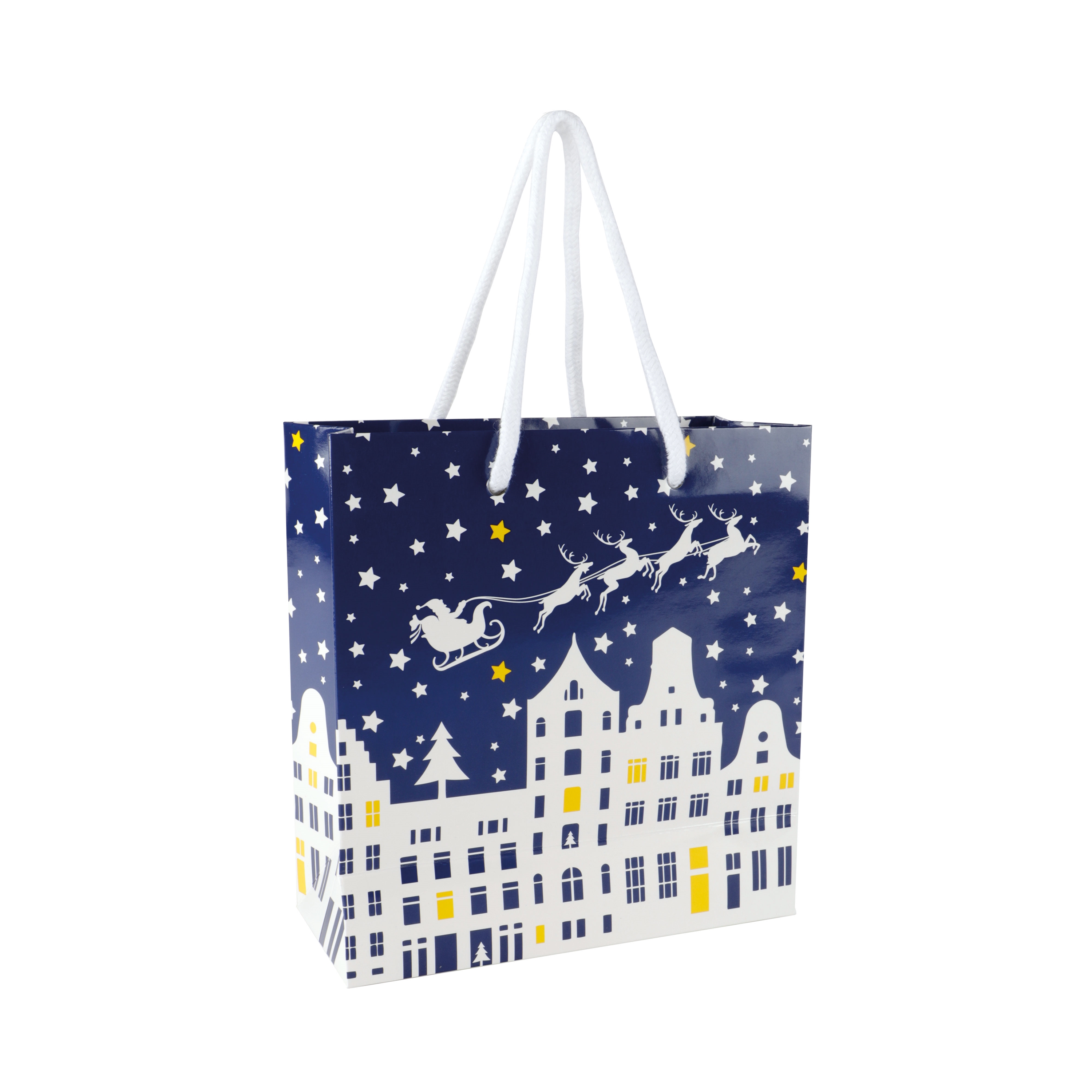 Dit typisch hollandse donkerblauwe venstertasje is rondom bedrukt met ons kerstdessin Geveltjes: een verzameling van grachtenpandjes. Met aan de voorzijde een venster van 12x12 cm.