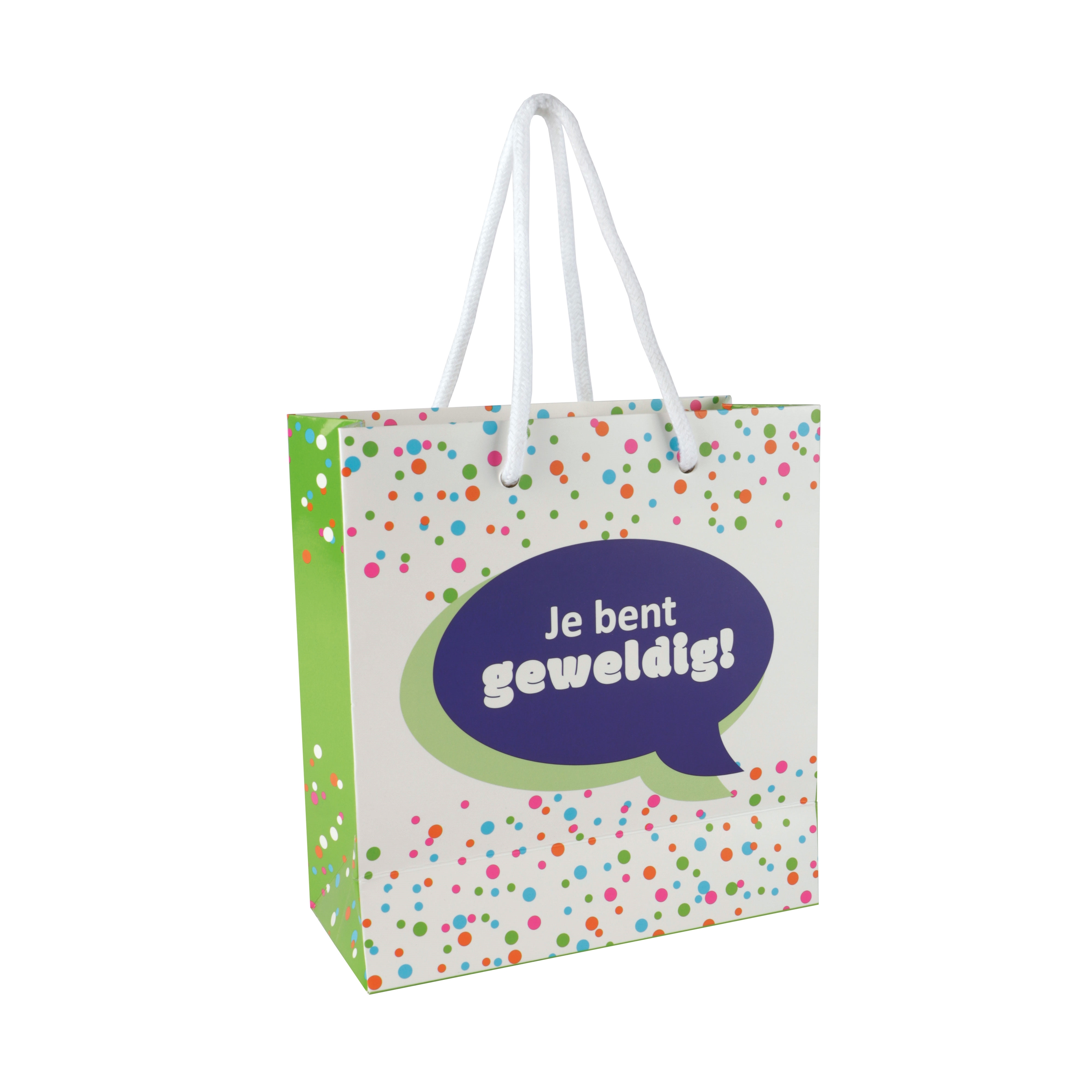 Dit vrolijke tasje is bedrukt met stippels en heeft aan de voorzijde een rond venster van 12 cm. De achterzijde heeft een bedrukking met de tekst:Je bent geweldig!