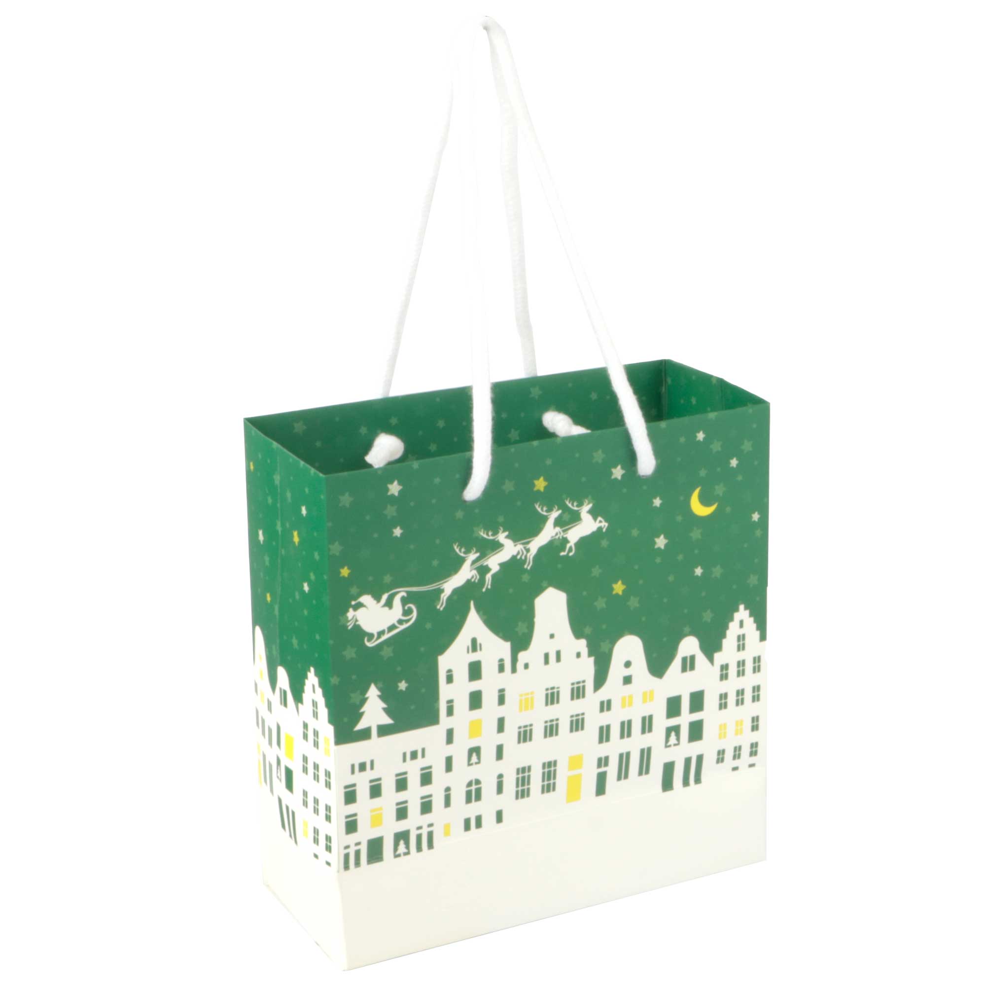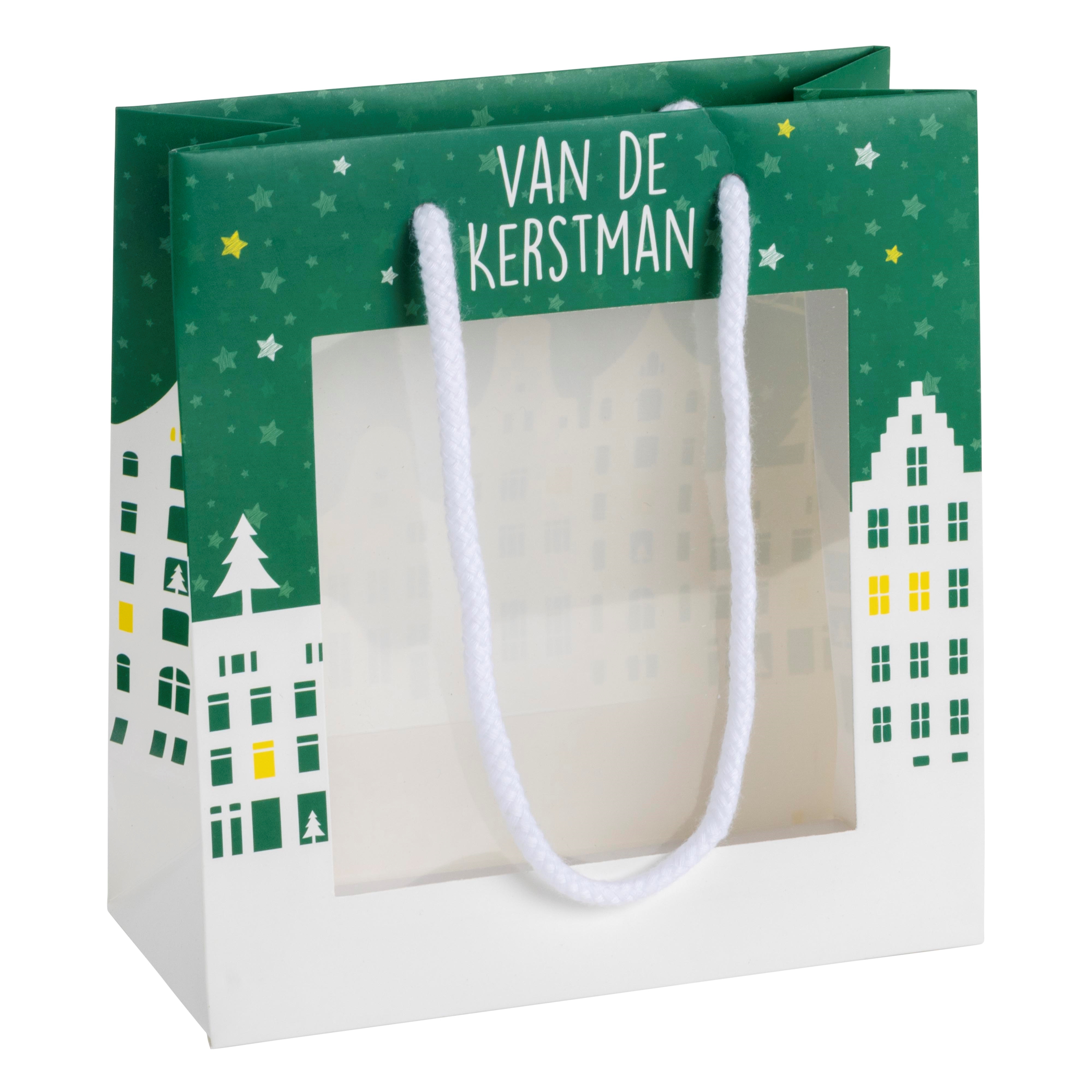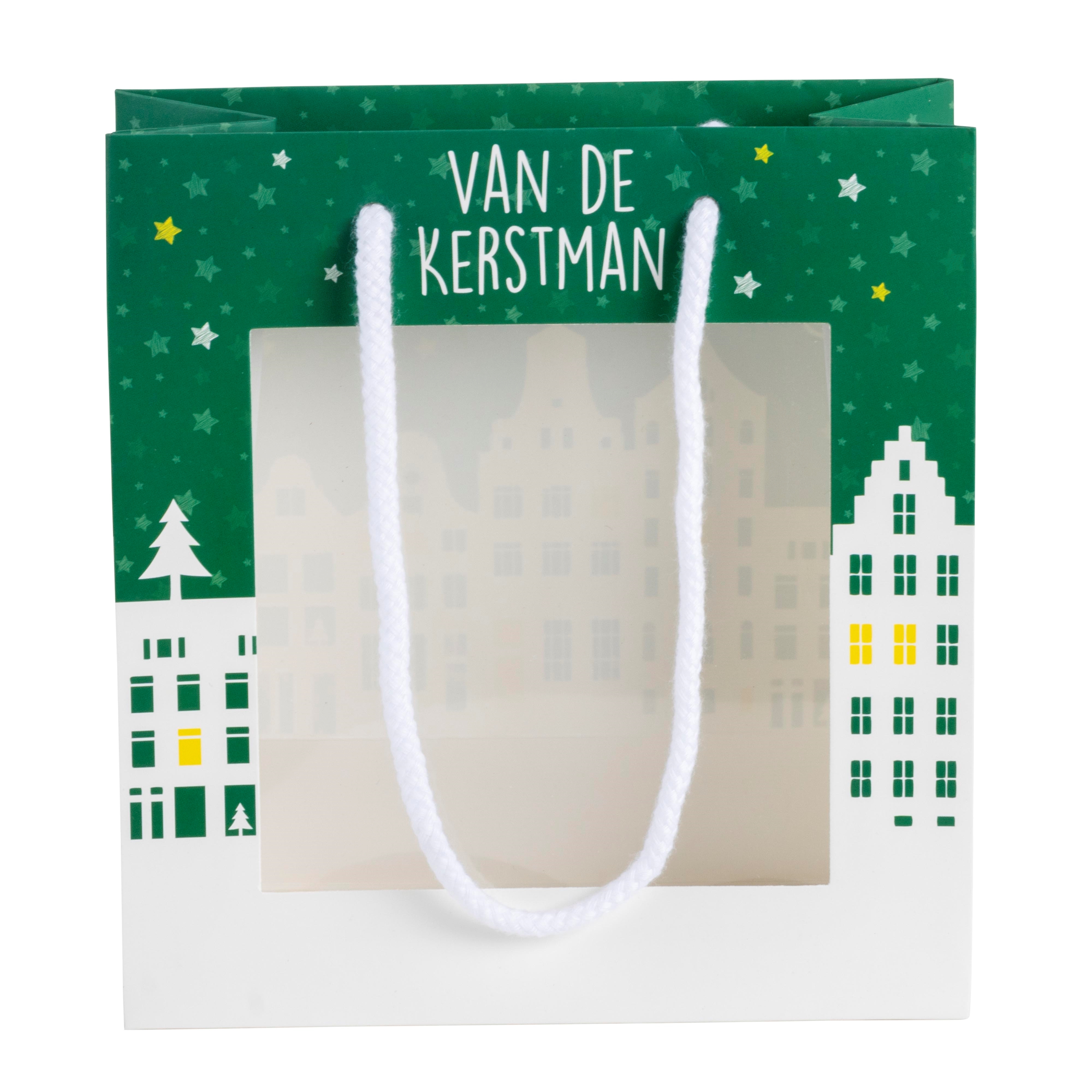 Dit typisch hollandse groene venstertasje is rondom bedrukt met ons kerstdessin Geveltjes: een verzameling van grachtenpandjes. Met aan de voorzijde een venster van 12x12 cm.