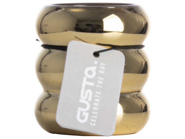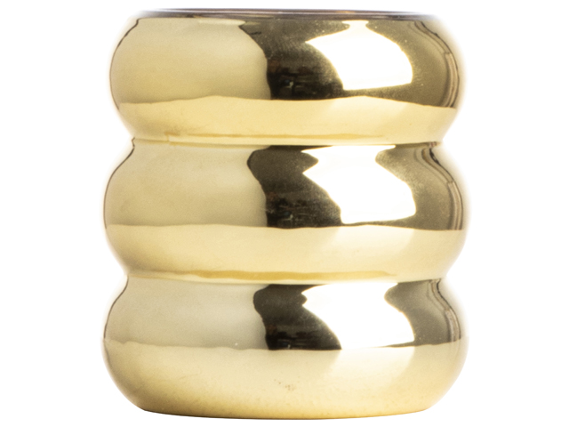 De kaars/theelichthouder is gemaakt van glas in een gouden kleur. Hij heeft een diameter van 6 cm en een hoogte van 6,5 cm.