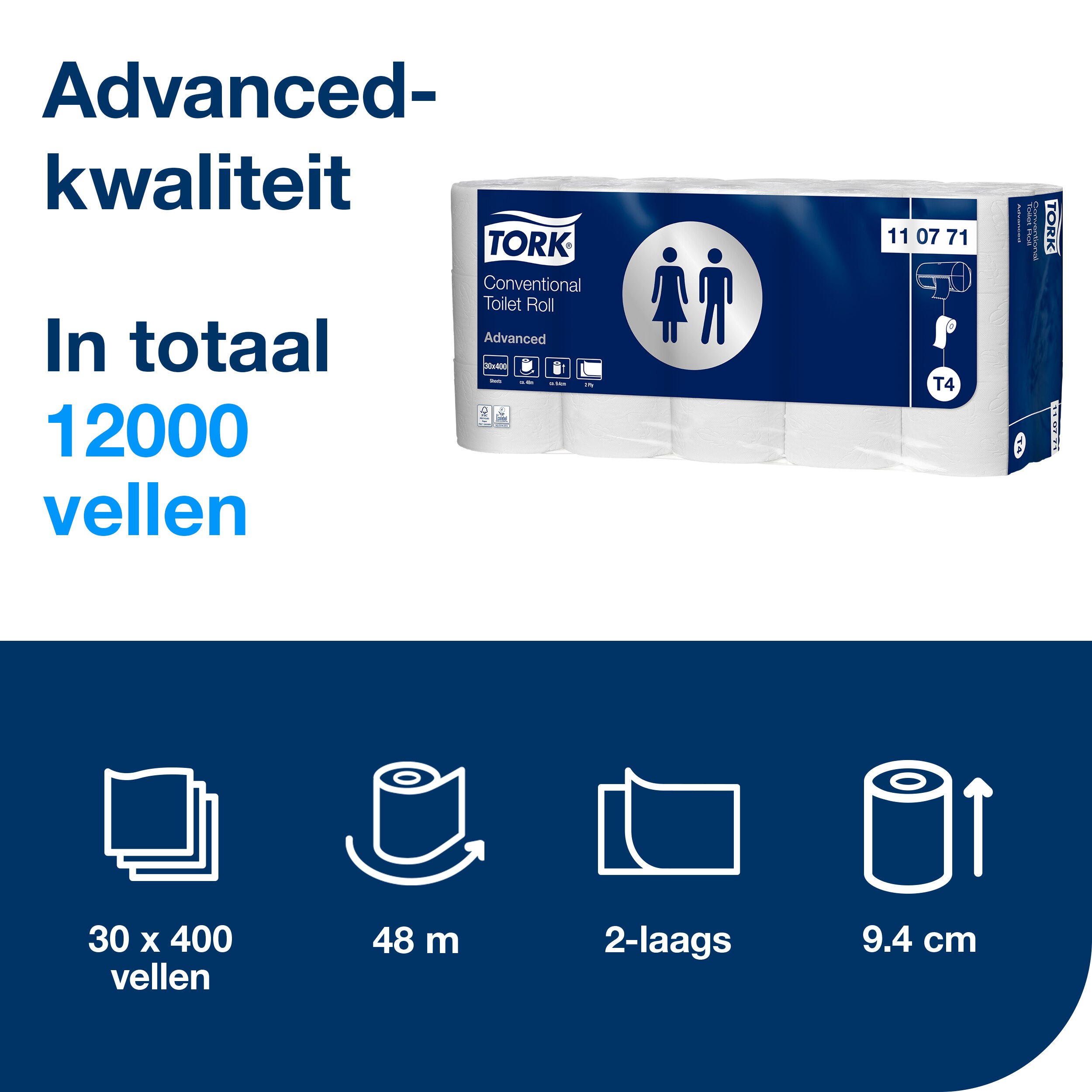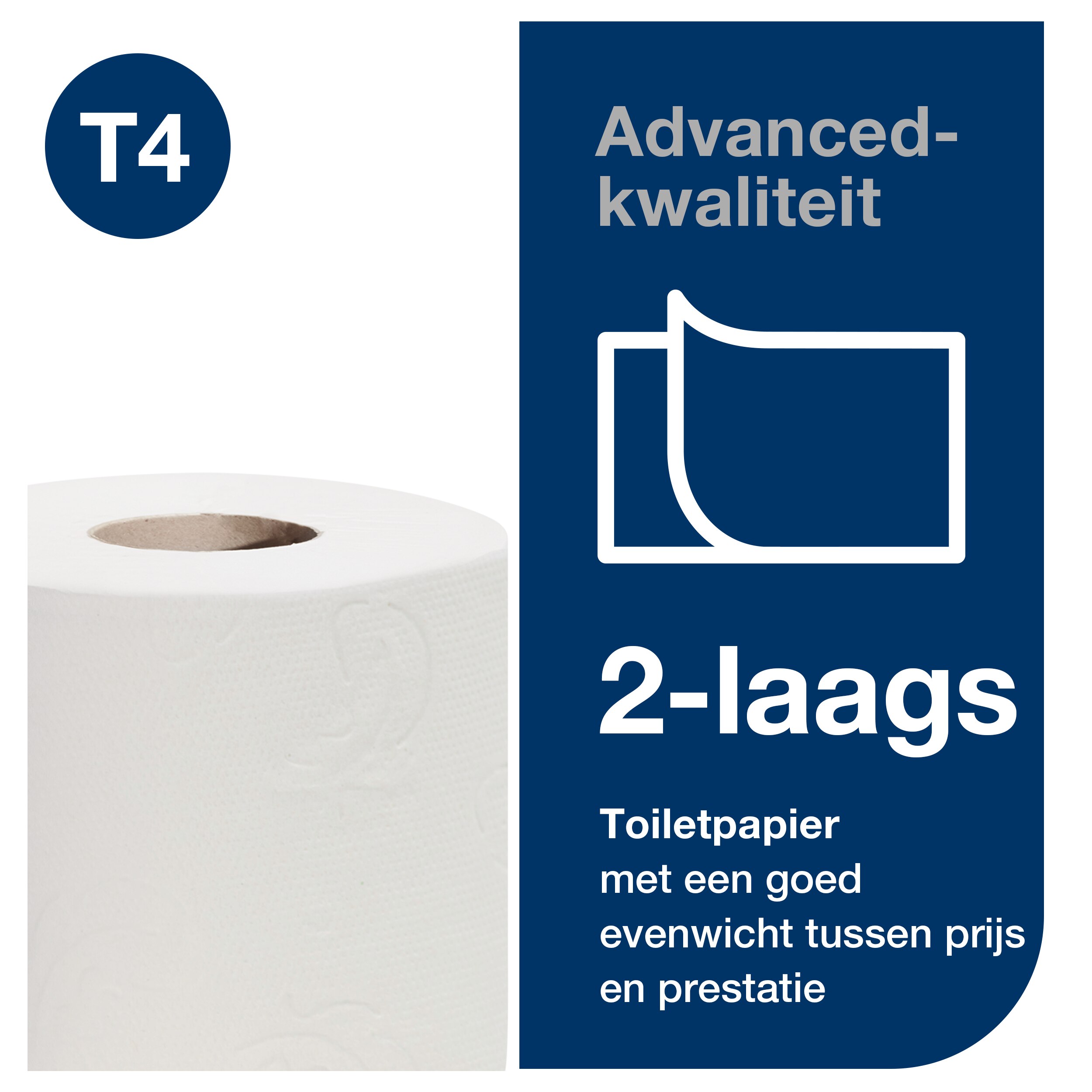 30 rollen, à 400 vellen. 2-laags. Advanced-kwaliteit. Afmetingen rol: B 48m D 9.4cm. Vellengte: 12cm. Diameter binnenkant huls: 4cm. Te gebruiken met T4 dispensers.