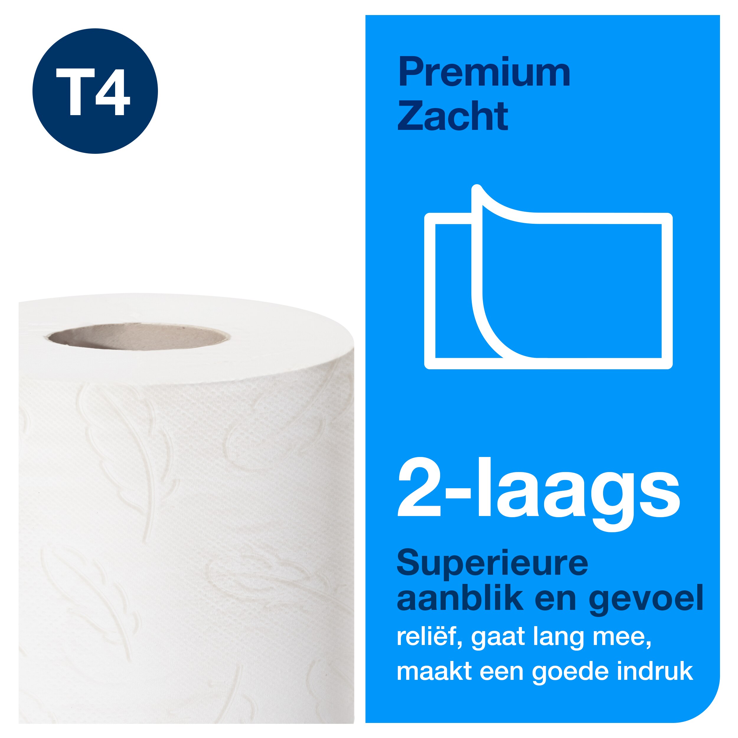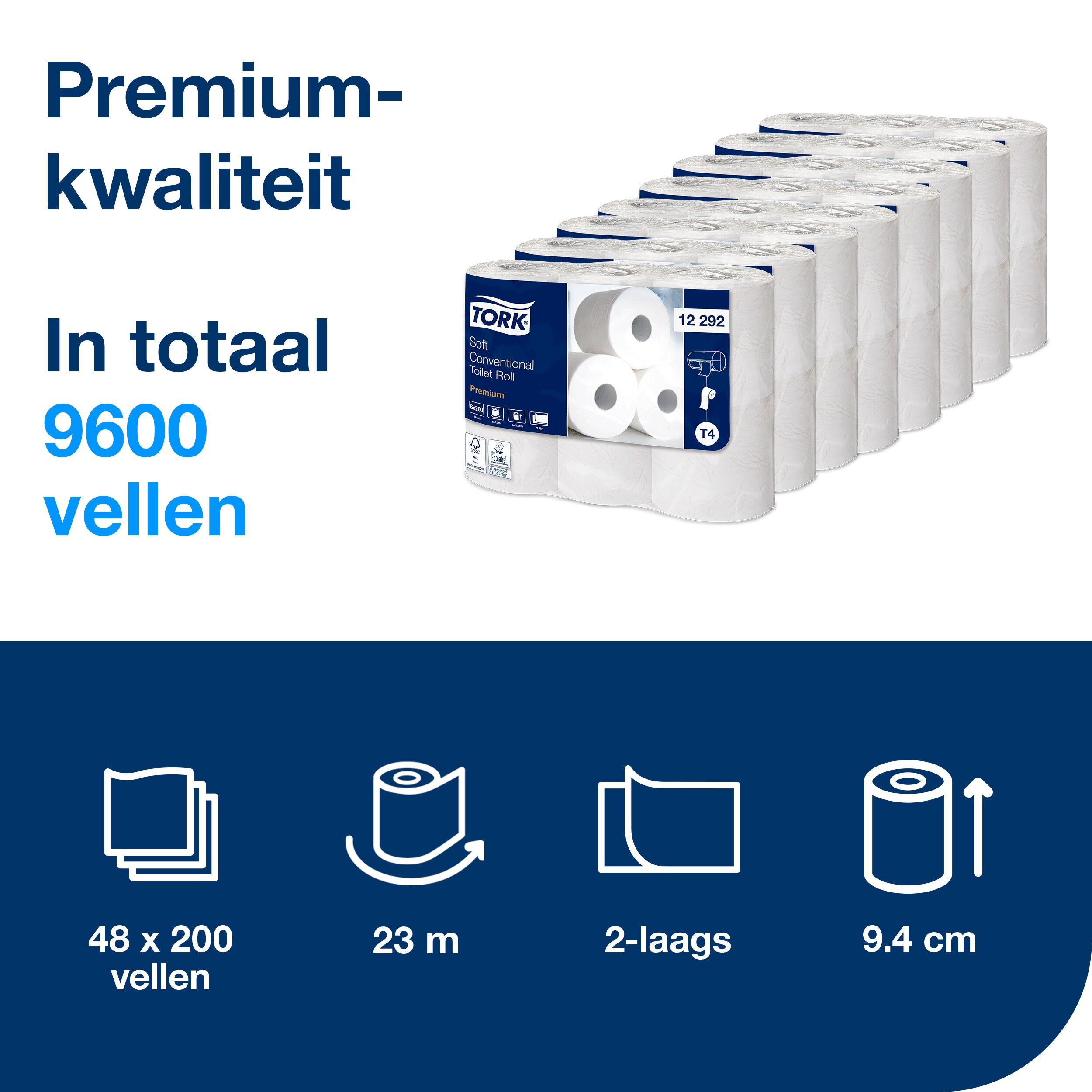 2-laags. Premium-kwaliteit. Afmetingen rol: B 23m D 9.4cm. Vellengte: 11.5cm. Diameter binnenkant huls: 4cm. Te gebruiken met T4 dispensers.