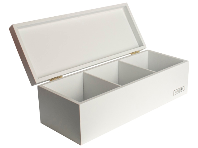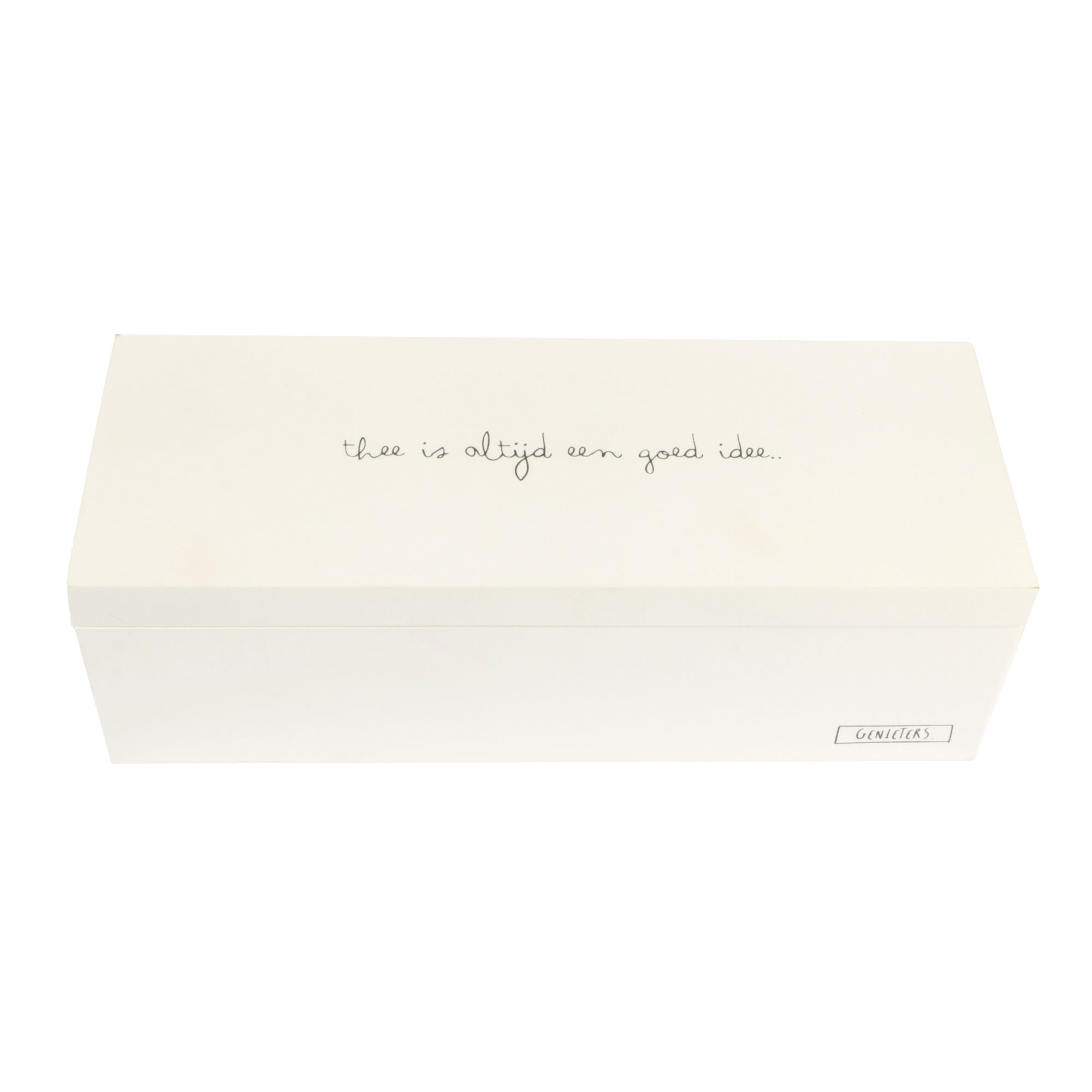 De witte GUSTA theedoos uit de Genieters-collectie is voor het opbergen en vers houden van al je favoriete theeën. De theedoos heeft drie vakken, een soepel scharniersysteem en een leuke quote.