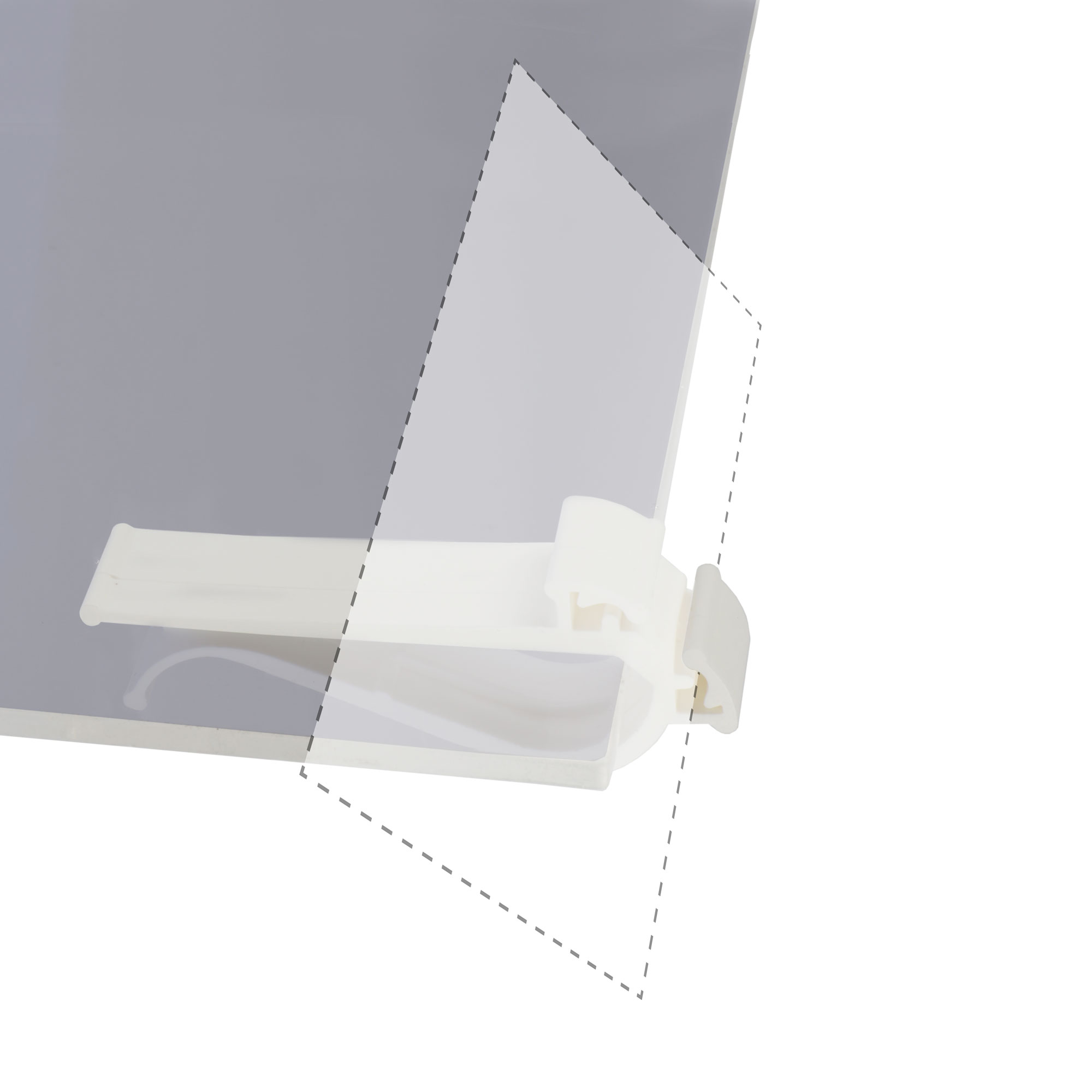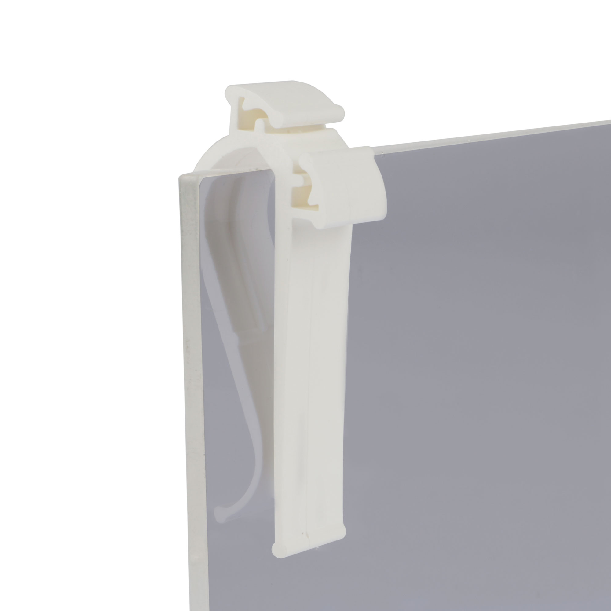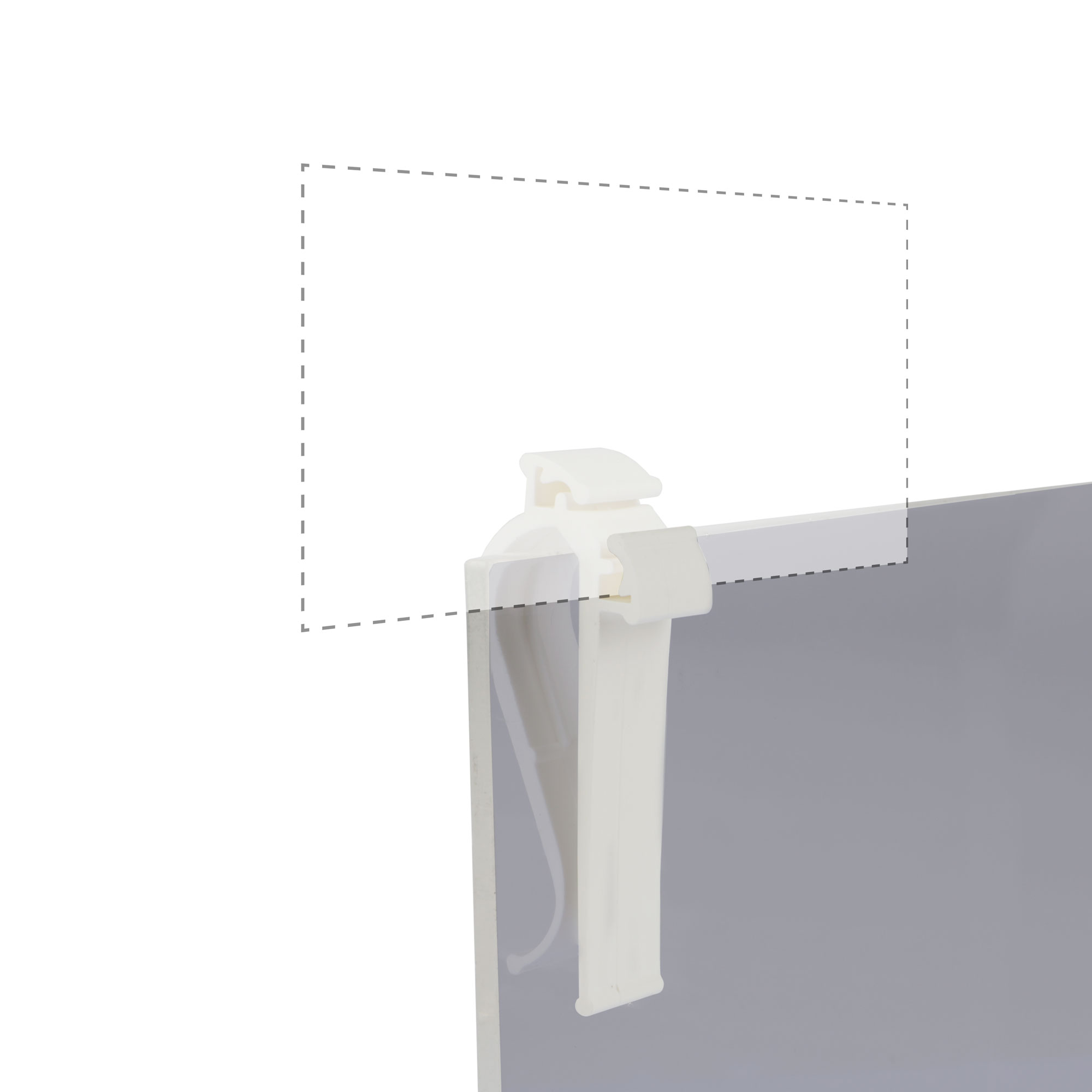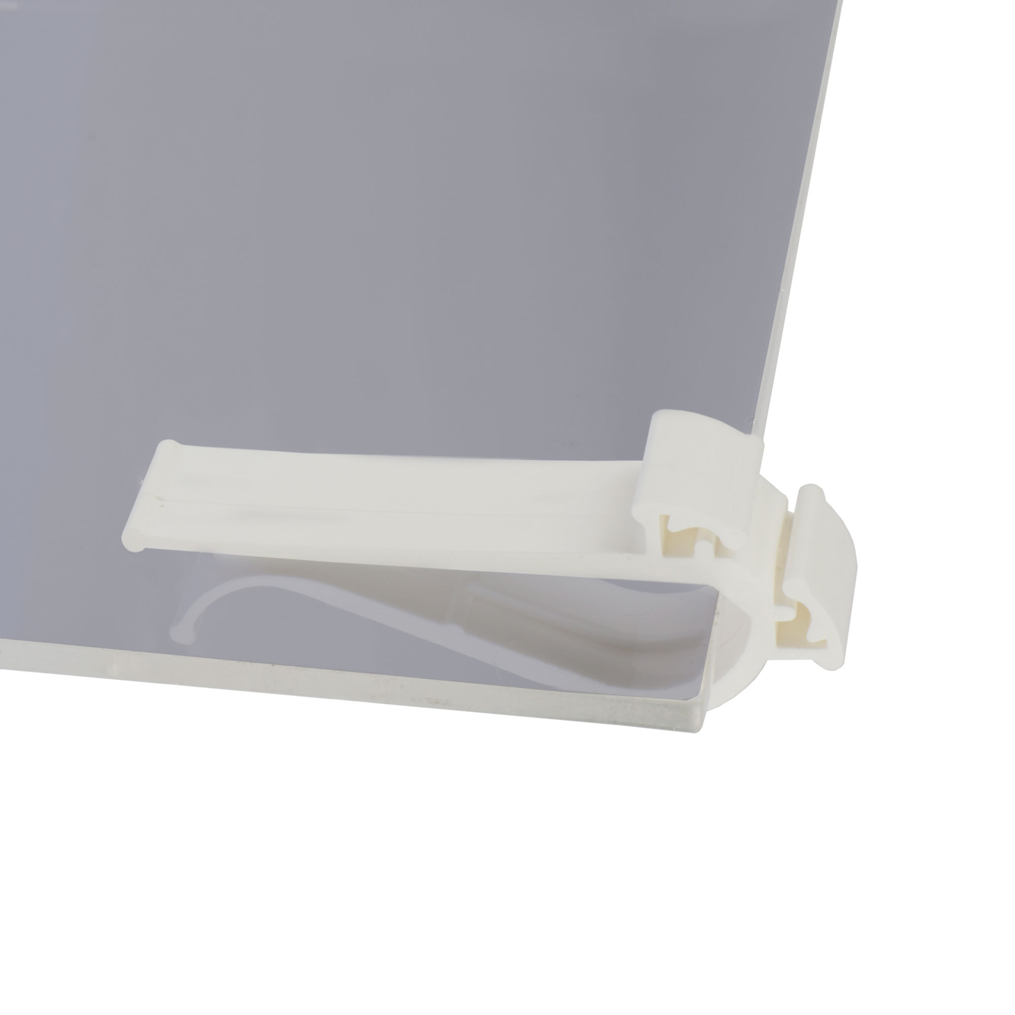 De klem wordt horizontaal of verticaal over bijvoorbeeld een glasplaat of andere dunne ondergrond geschoven. Vervolgens kan de prijskaart in de gleuven worden geklemd.