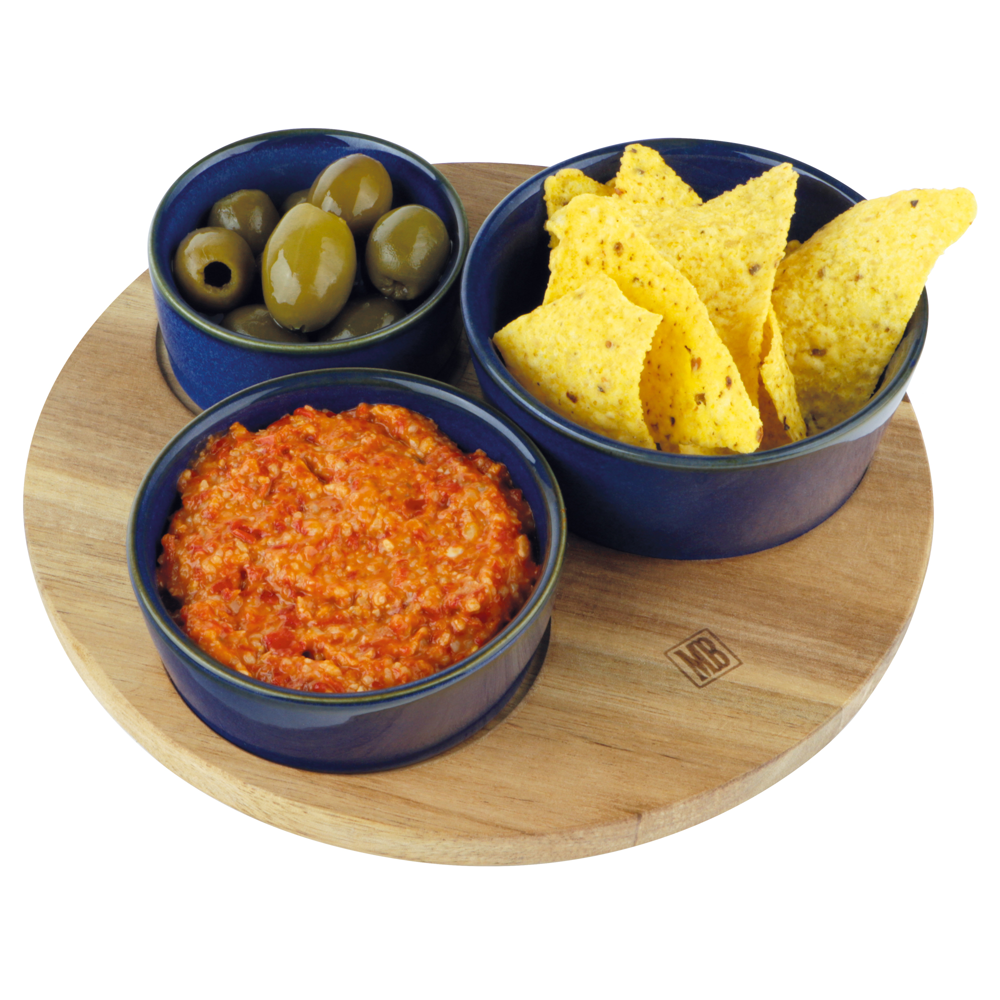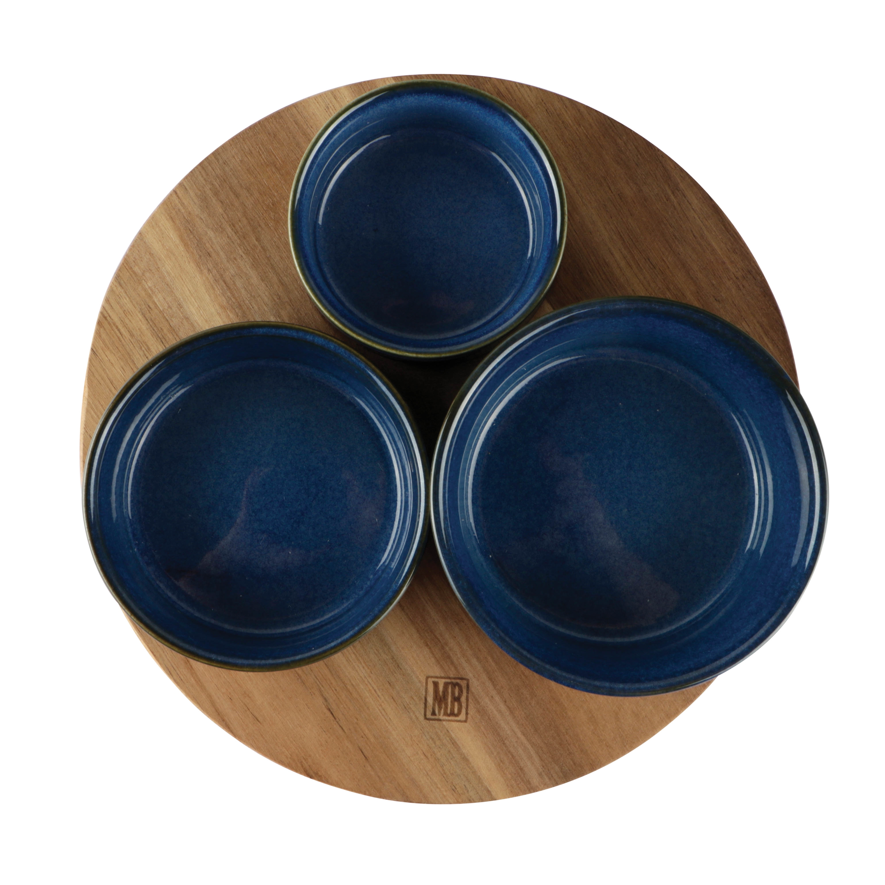 Deze set uit de serie met blauw keramiek van Maison Bleu bestaat uit een ronde acacia plank met drie schaaltjes in verschillende maten.