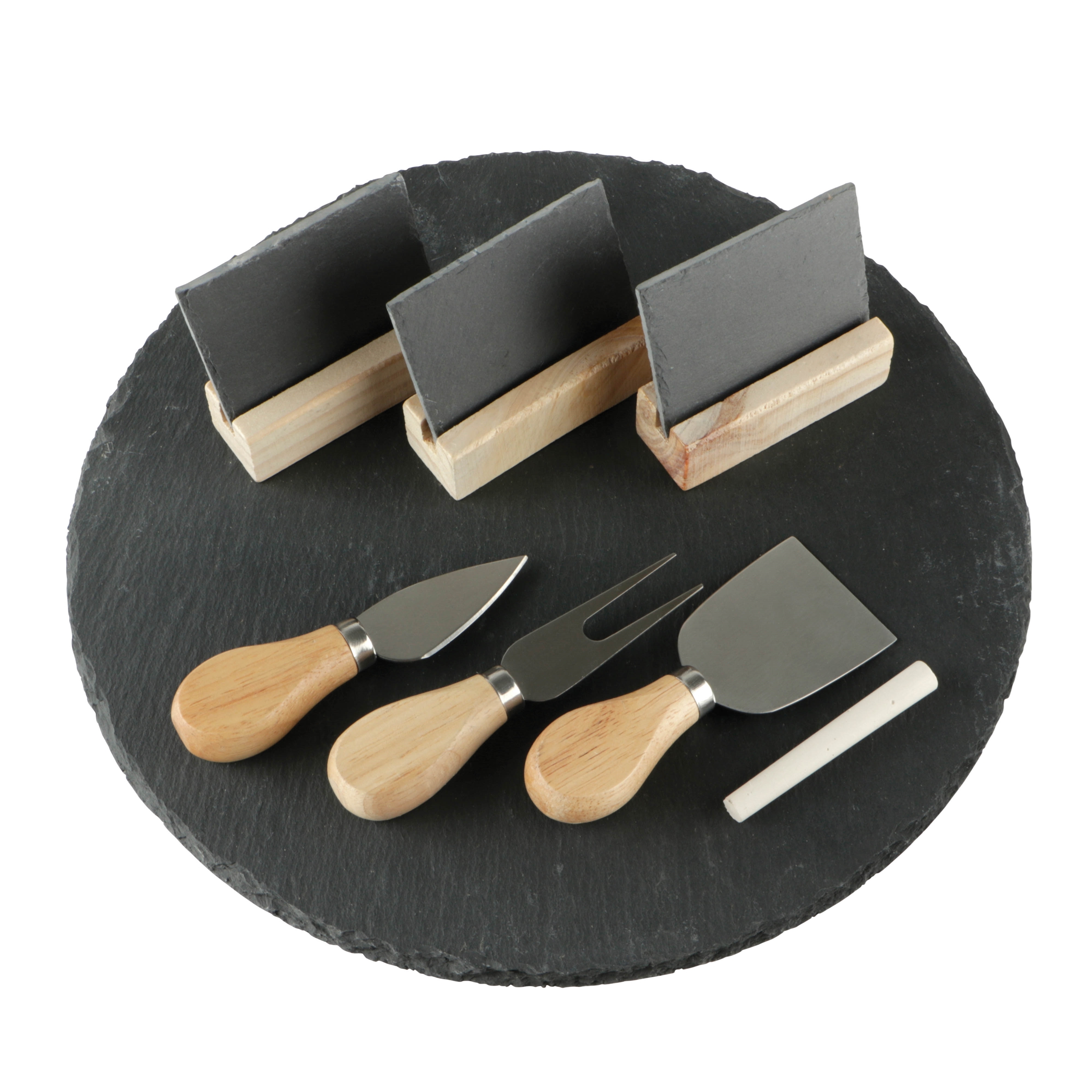 BREUK Leisteen serveertray met 2 kaasmesjes, vork, krijtje en 3 naambordjes