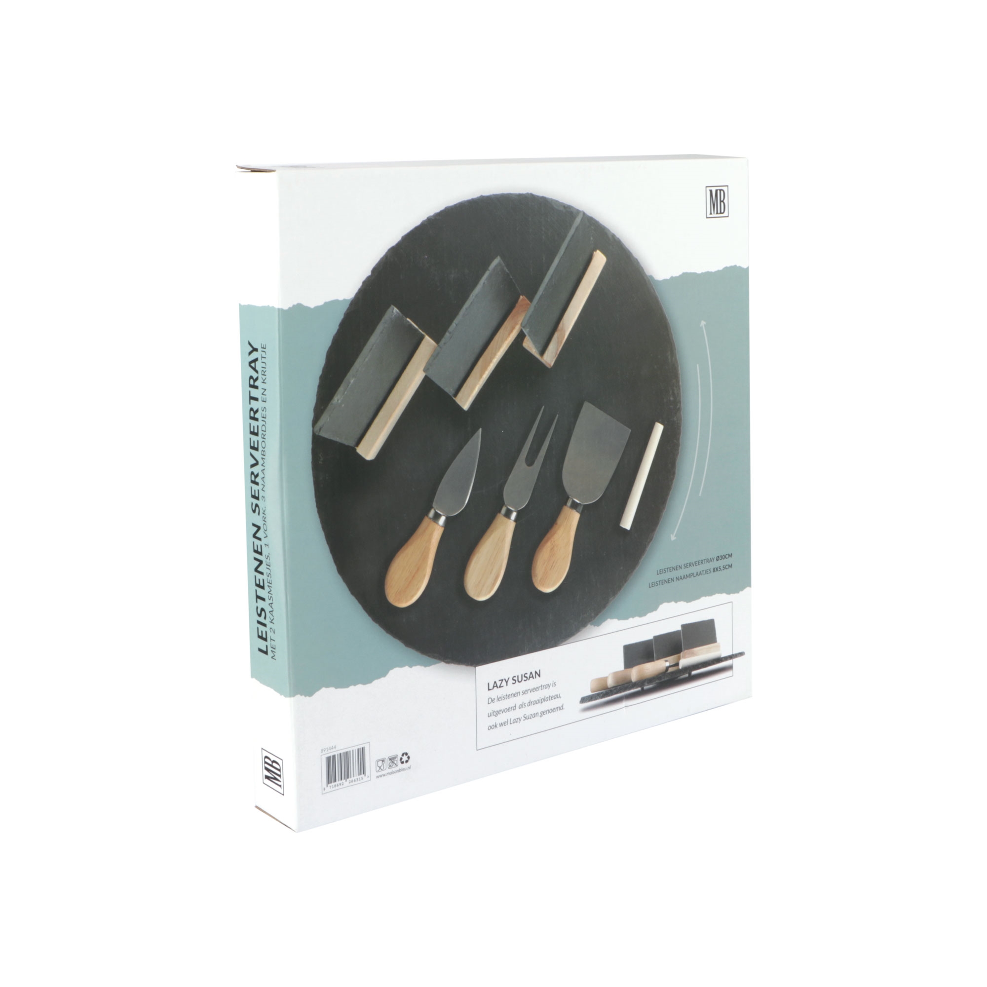 De set wordt compleet geleverd met twee kaasmesjes, een kaasvork, drie krijtbordjes en een krijtje. Handig om aan te geven welk kaasje er op de plank ligt!