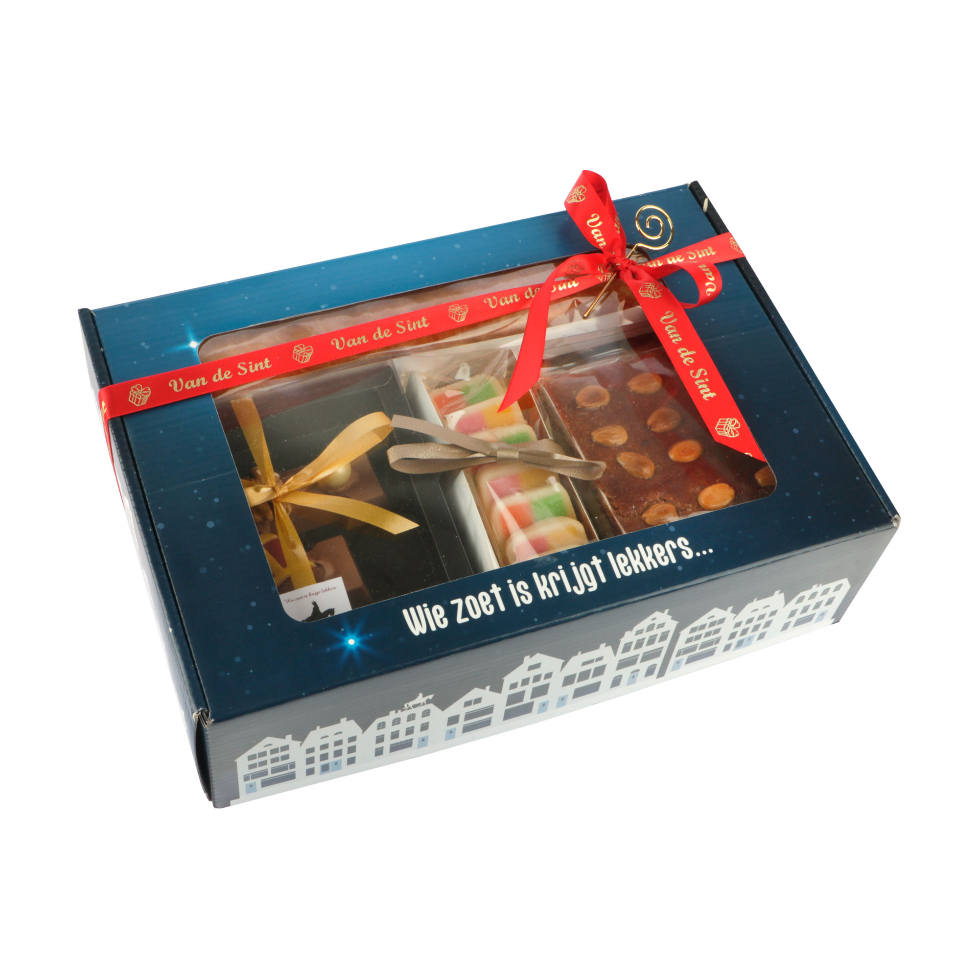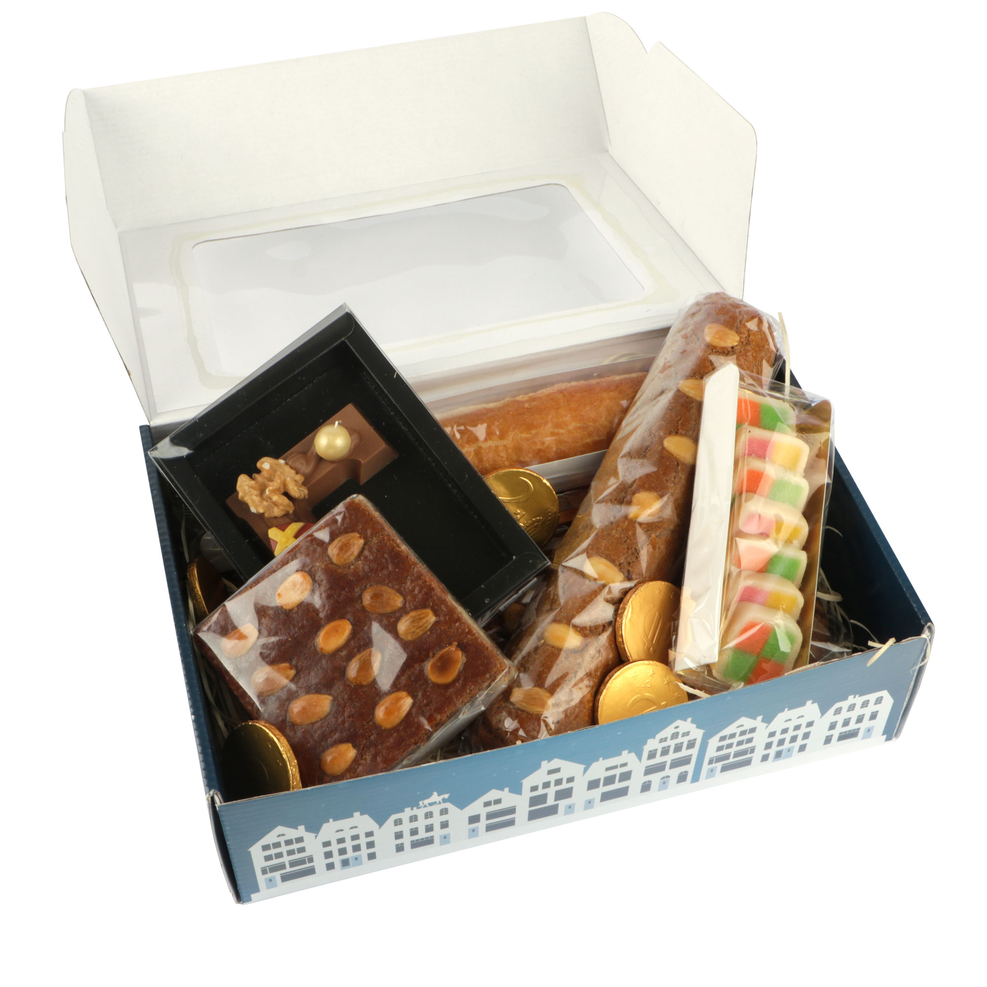 Een opvallende (blauwe) 'Sinterklaas' vensterdoos om te gebruiken als pakket.