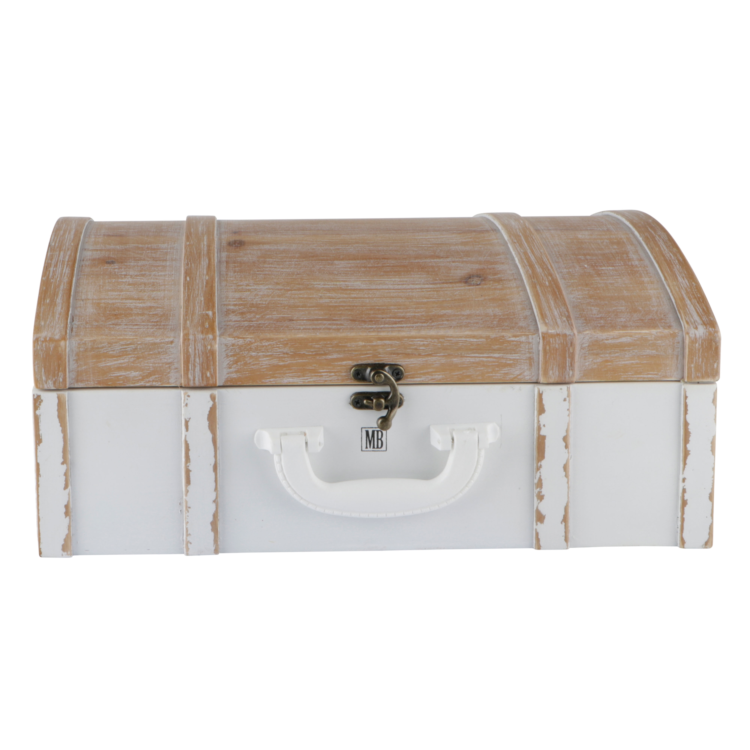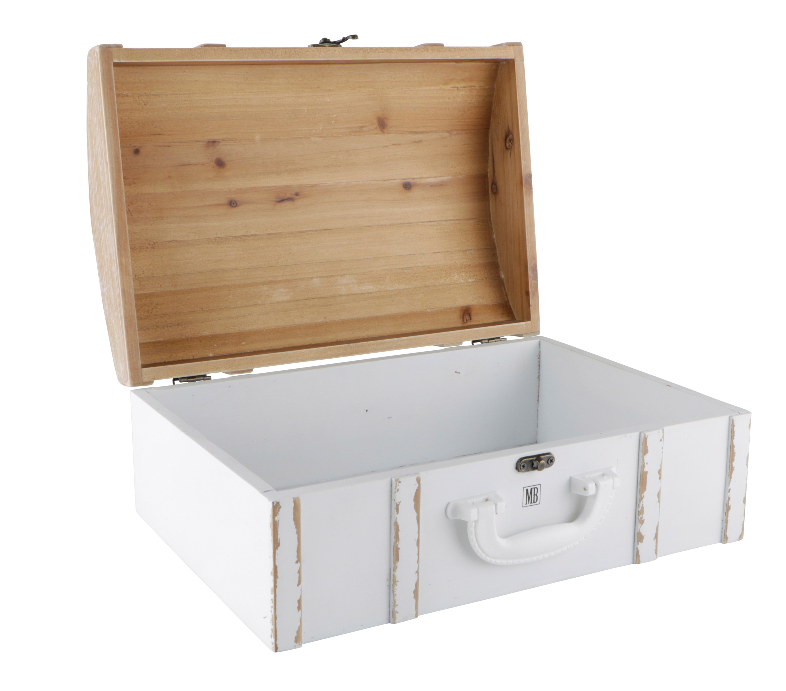 White wash houten koffer met een onbehandelde deksel. De koffers zijn te gebruiken ter decoratie of om spulletjes op te bergen. Te verkrijgen in 3 maten.