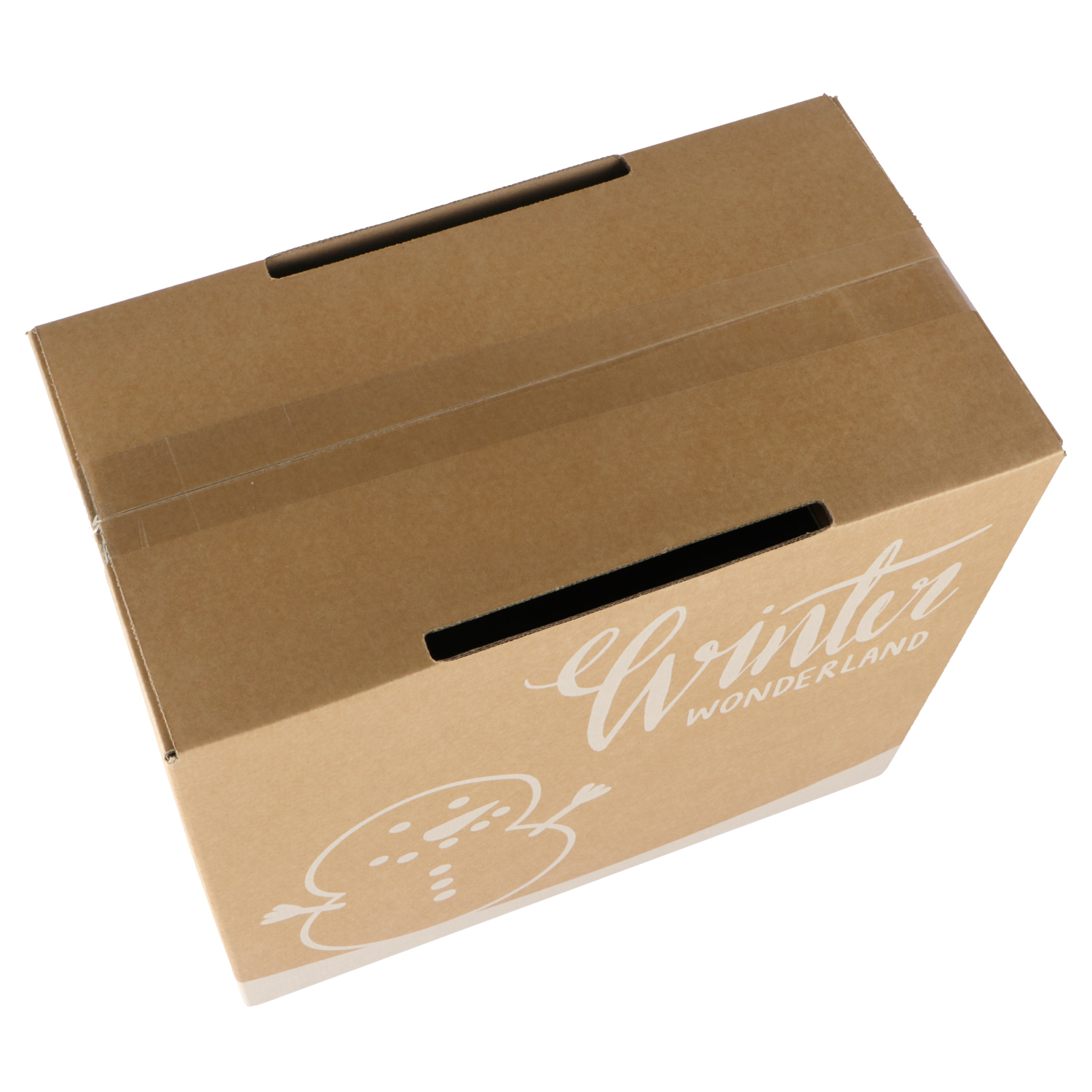 Deze pakketdoos wordt een draagdoos in combinatie met de bijpassende jute tas. De doos is voorzien van openingen waar de hengsels van de tas perfect inpassen. De tas is leverbaar met dezelfde Winter Wonderland bedrukking als de doos, maar ook in een onbedrukte uitvoering.