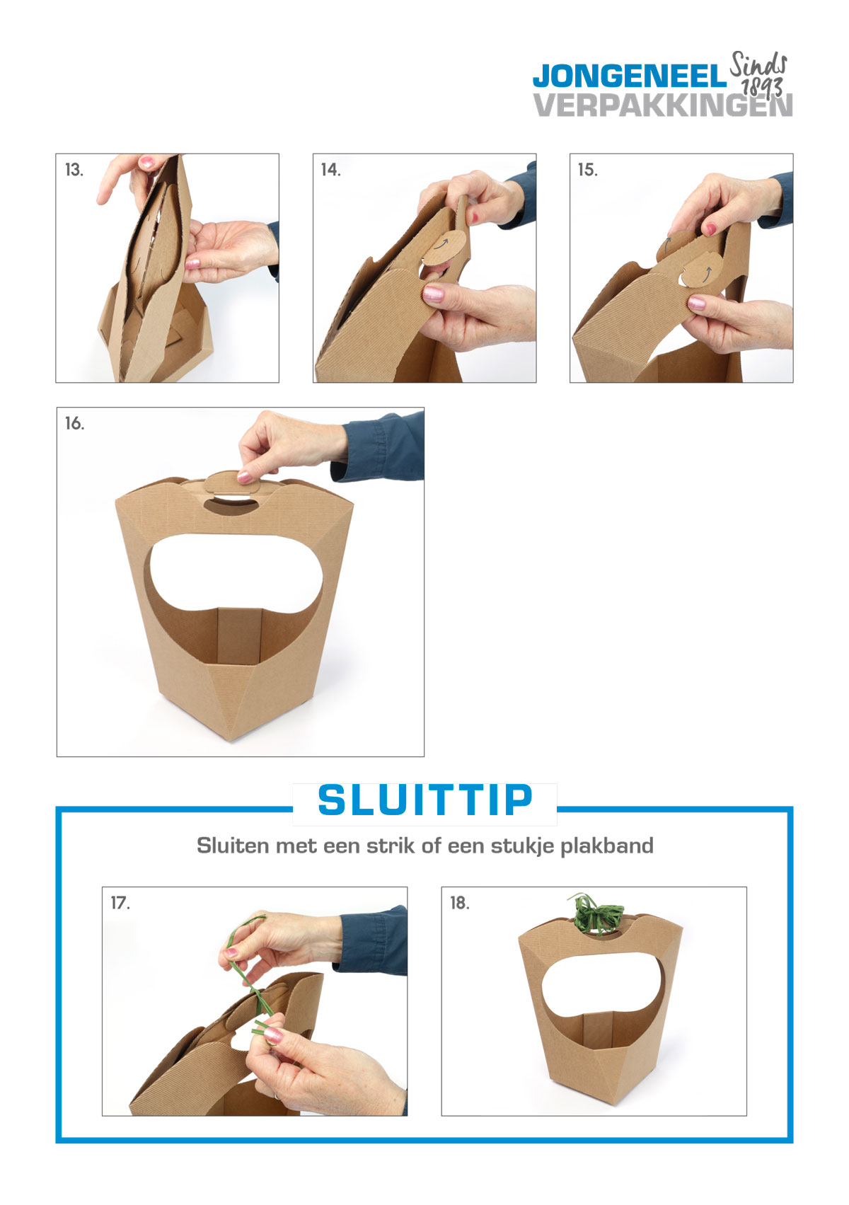 Deze pakketbak met greep heeft wel een hele bijzondere vorm. De bak is geheel van karton en in 2 kleuren beschikbaar, kraft en zwart.