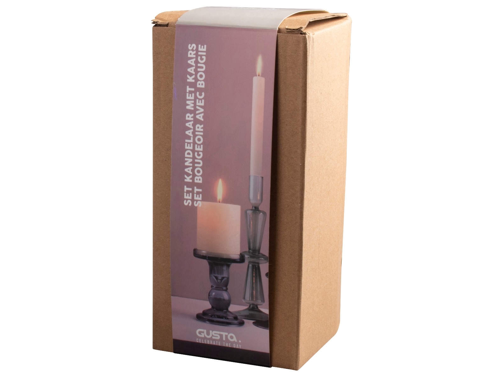 Prachtige glazen kandelaar, inclusief bijpassende stompkaars In acetaatdoos, 25,5x9x2,1 cm.