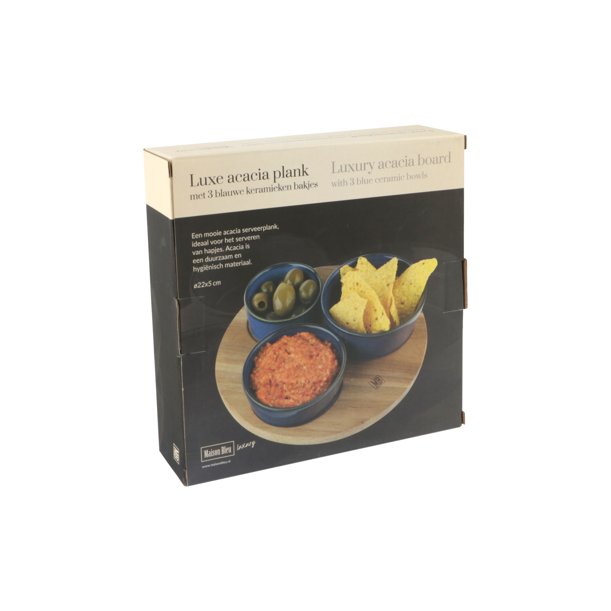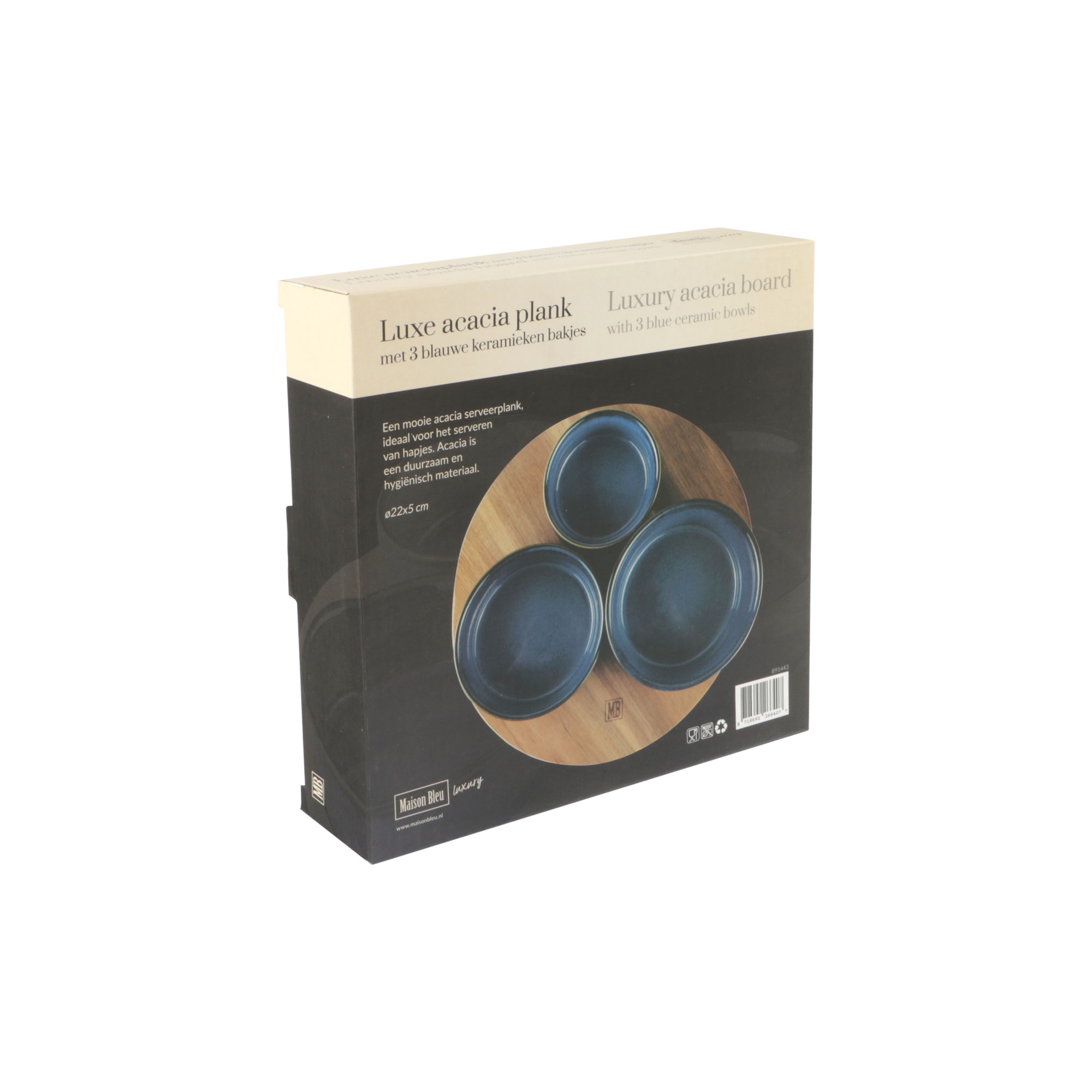Deze set uit de serie met blauw keramiek van Maison Bleu bestaat uit een ronde acacia plank met drie schaaltjes in verschillende maten.