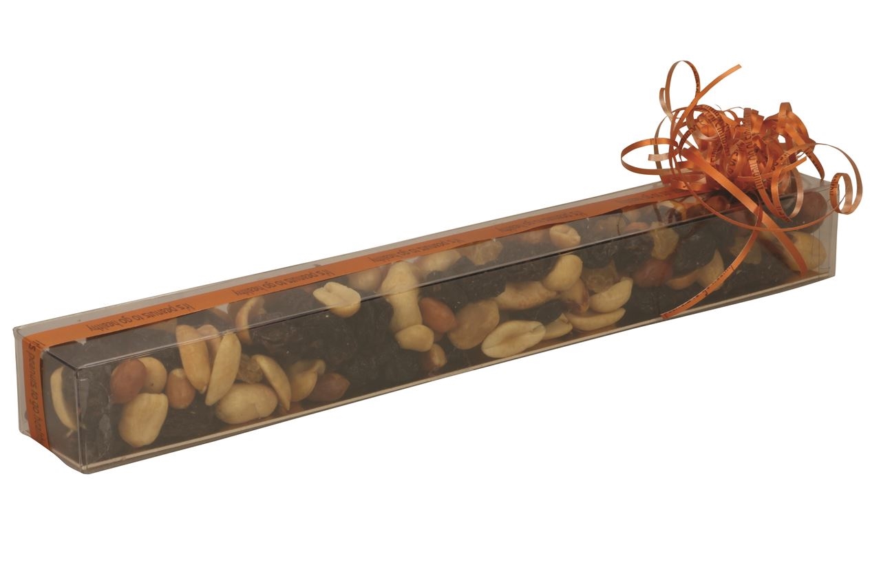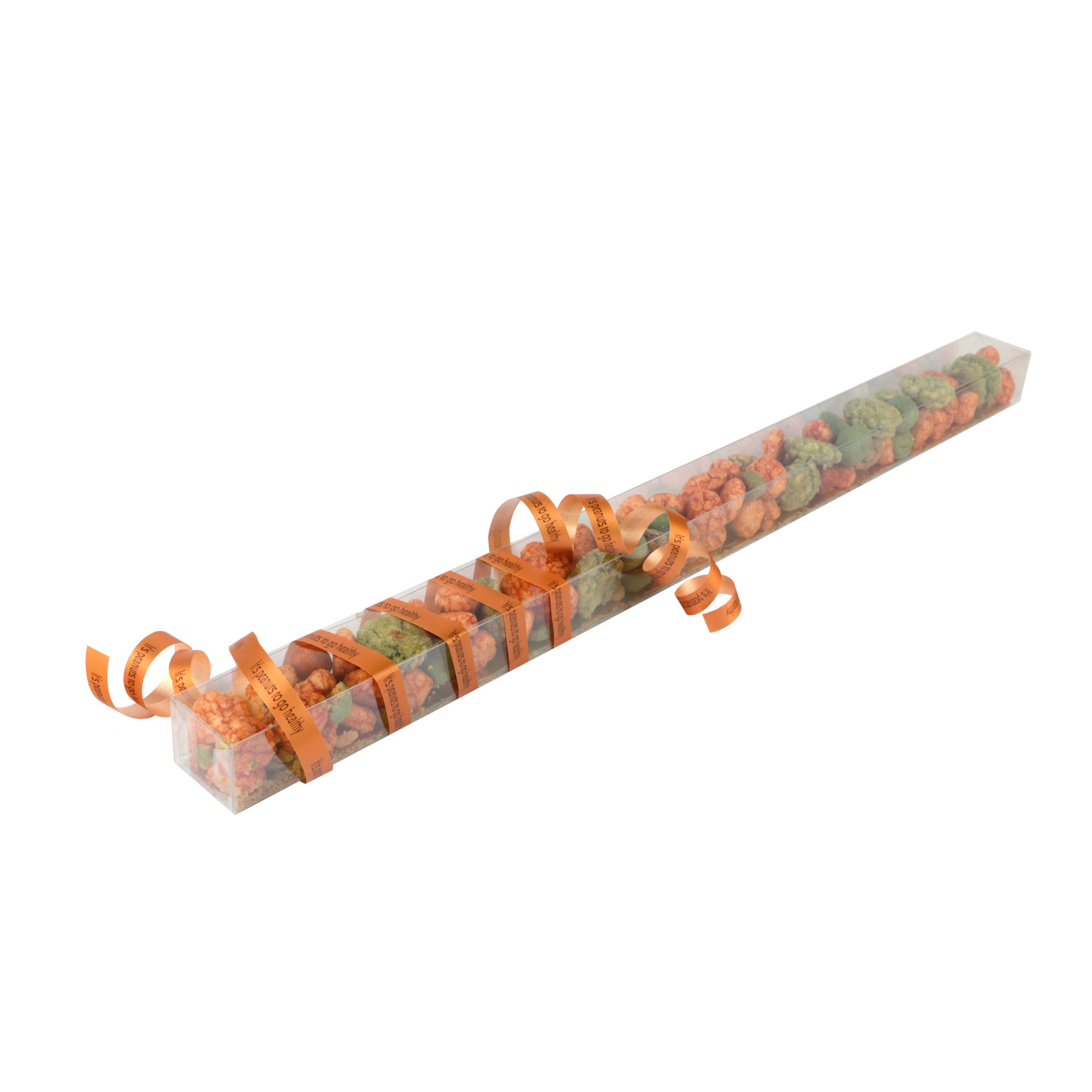 Een acetaatdoosje van 50 cm lang, daar past aardig wat in! Een halve meter om precies te zijn. Maak er een leuk kado idee van door het doosje te presenteren als bijvoorbeeld "een halve meter noten" of een "halve meter chocolade". Leuk en lekker!