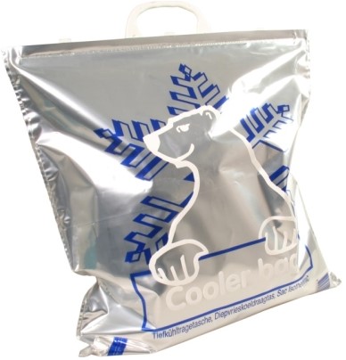 Zilverkleurige, reflecterende draagtas van stevig kunststof (LDPE), houdt de warmte langer buiten.