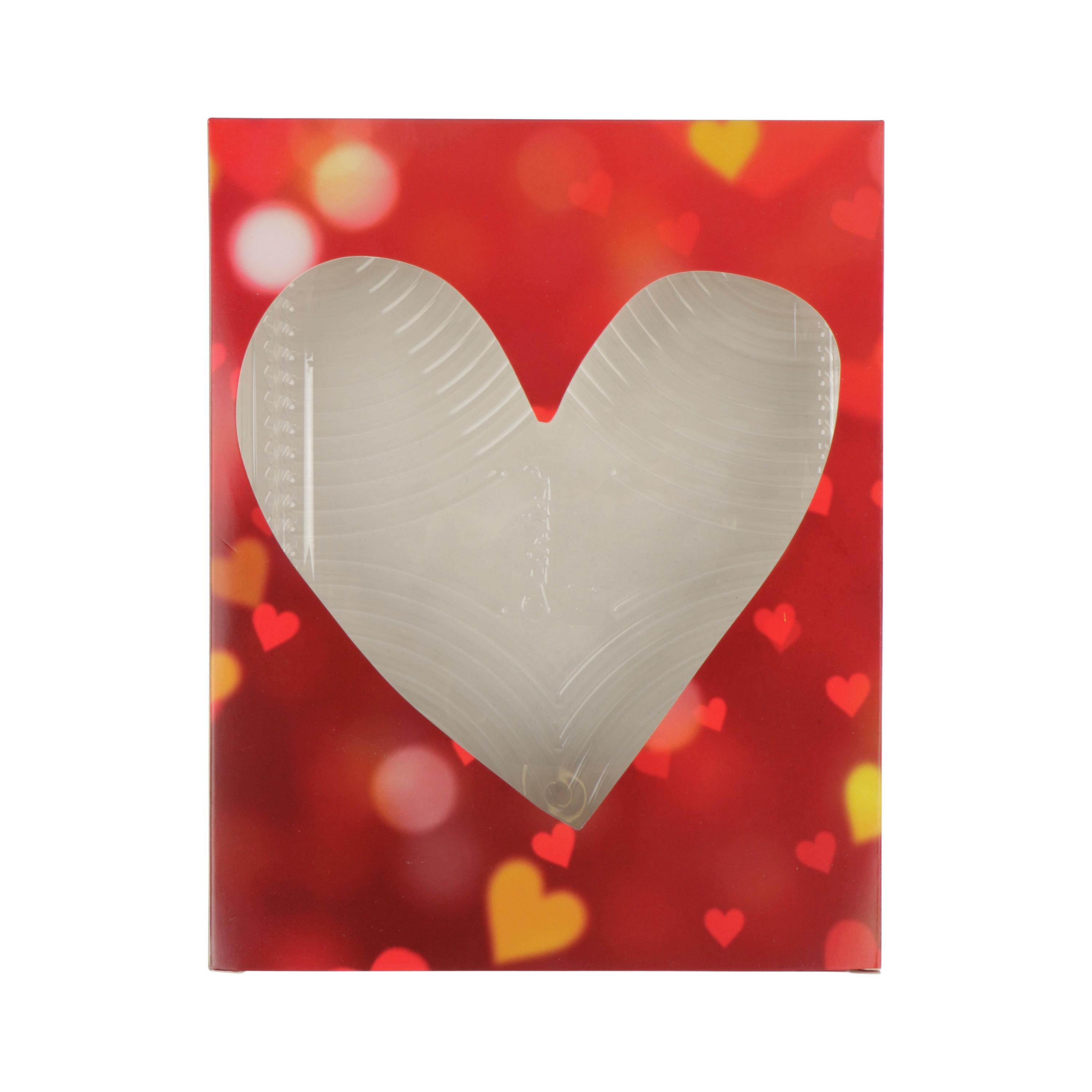 Een transparant APET binnenbakje dat gevuld kan worden met uw producten, en een kartonnen doosje met een gestanst hartvormig venster.