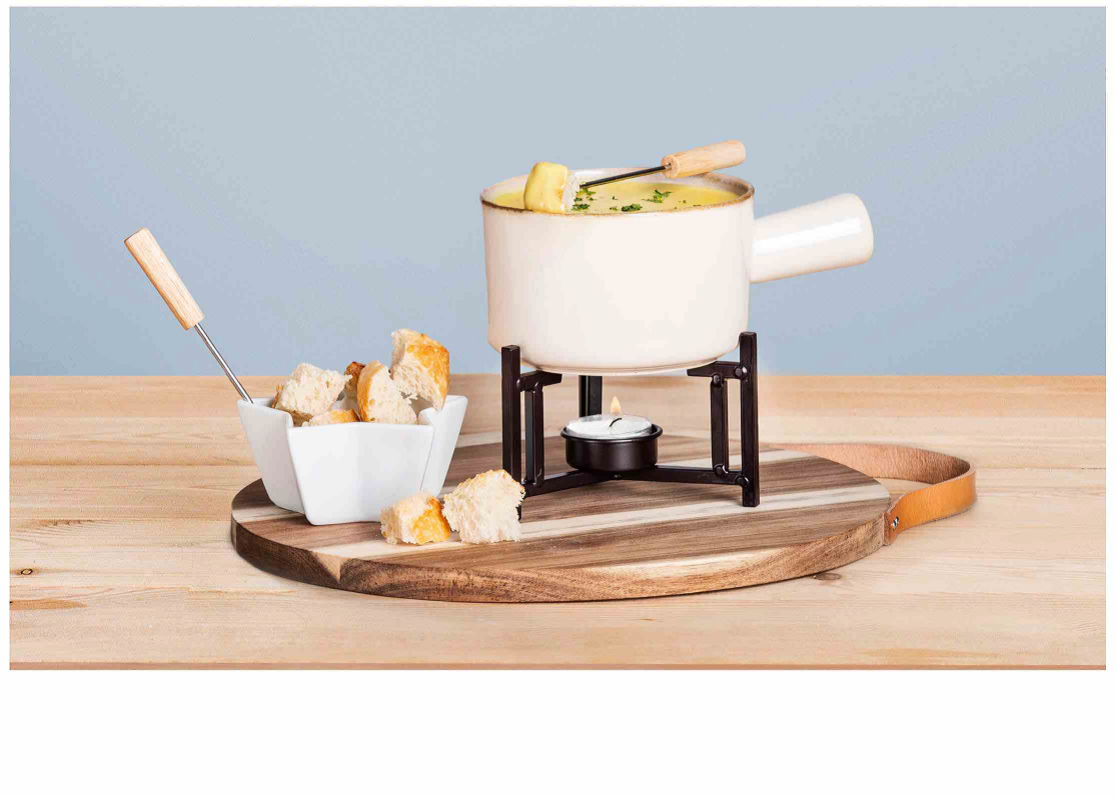 Robuust crèmekleurig fonduepannetje op zwart onderstel. Geschikt voor 2 personen. Lekker samen genieten van een heerlijke kaasfondue.