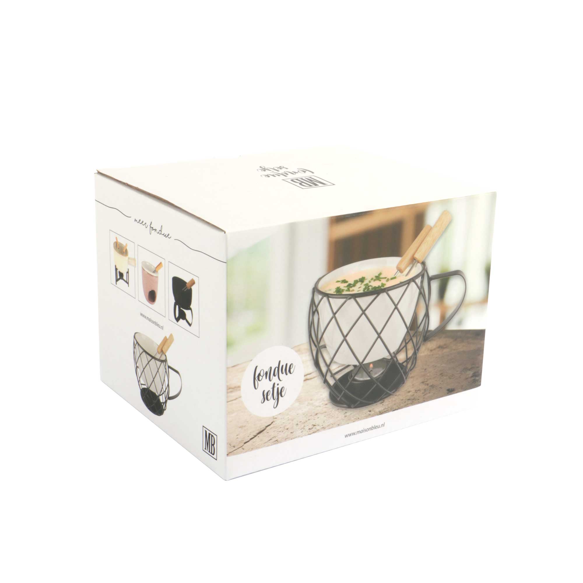Fondueset metaal/keramiek met 2 vorkjes mat zwart/wit