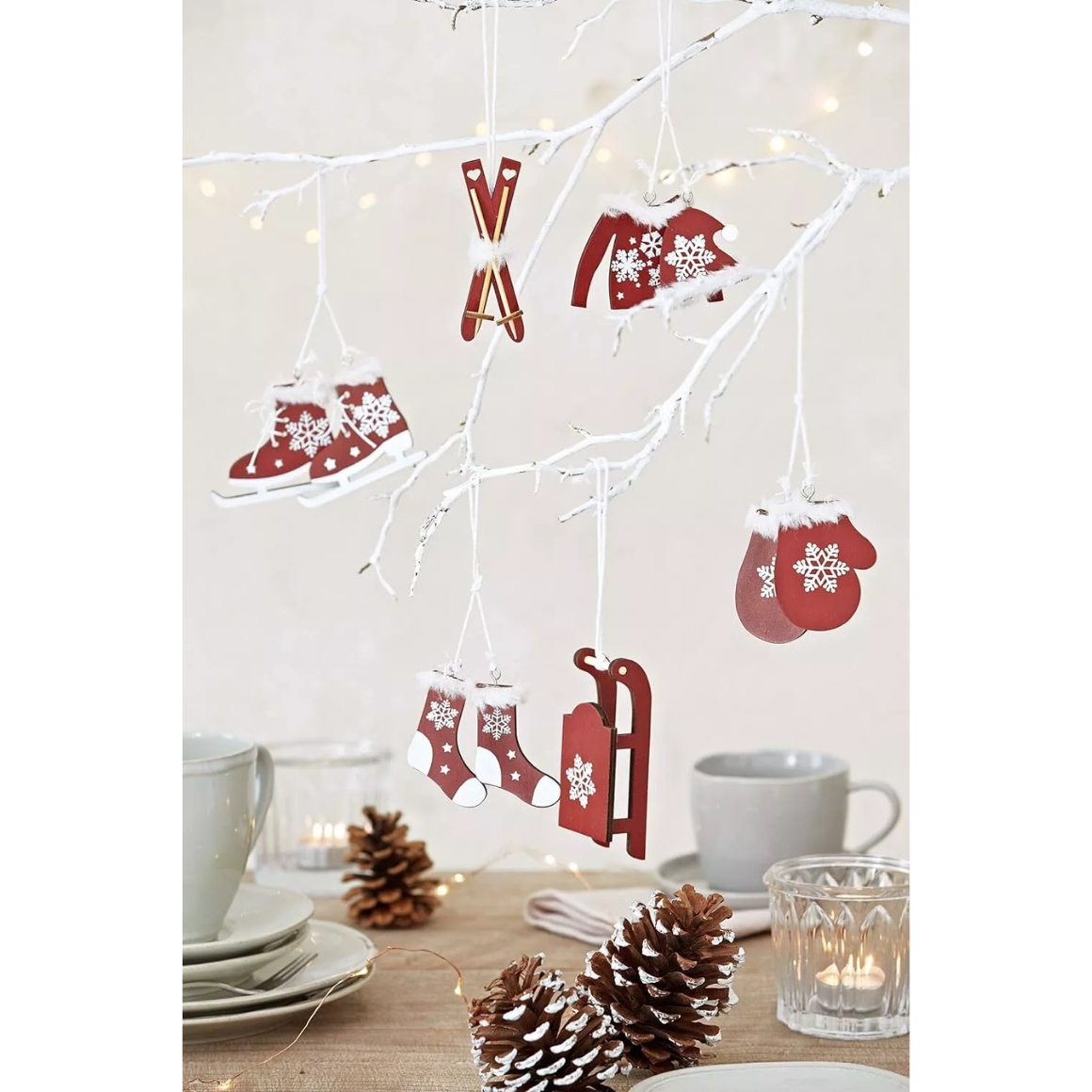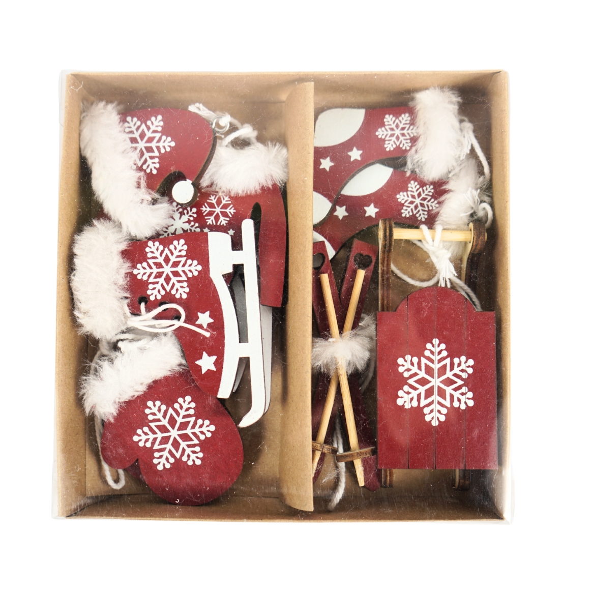 Hangdecoratie kerst hout bordeaux/wit 10 cm set van 6