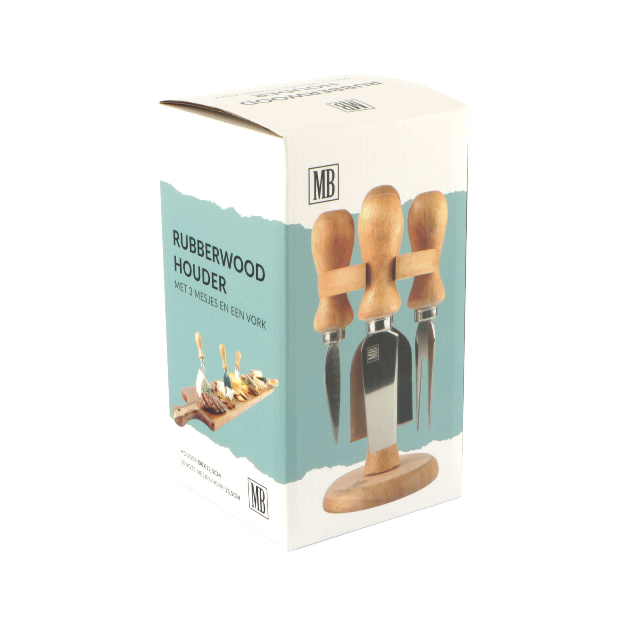 Houder rubberwood met vork en 3 mesjes 8x17 cm (uc)