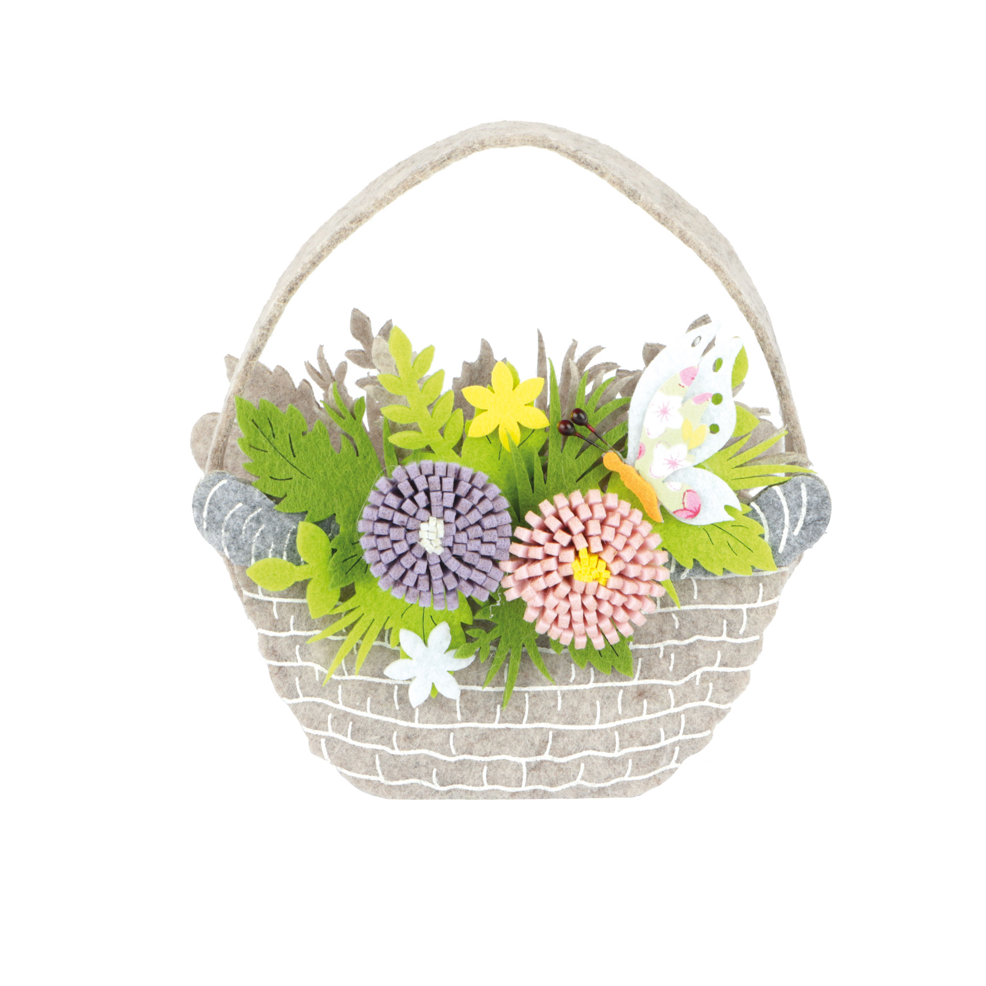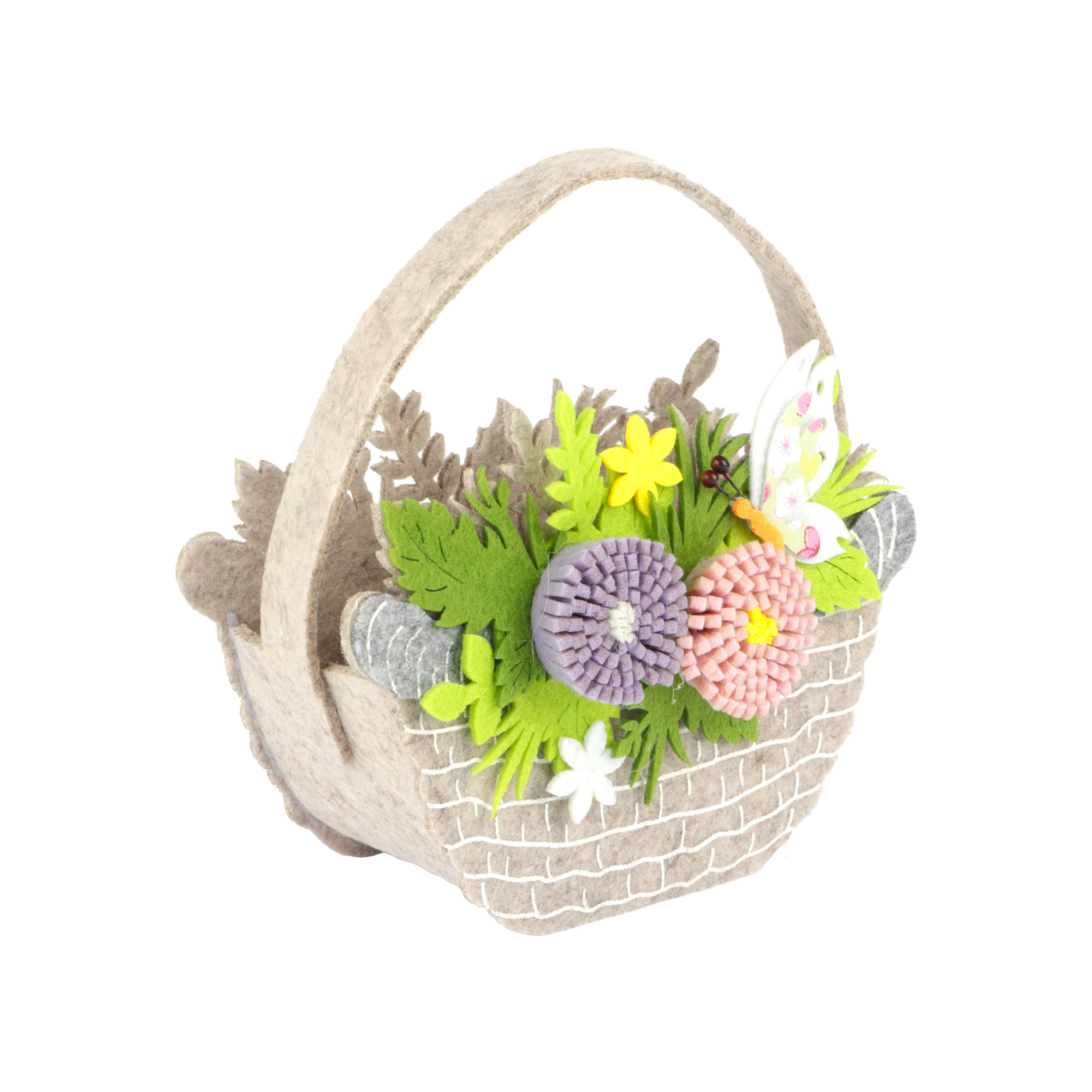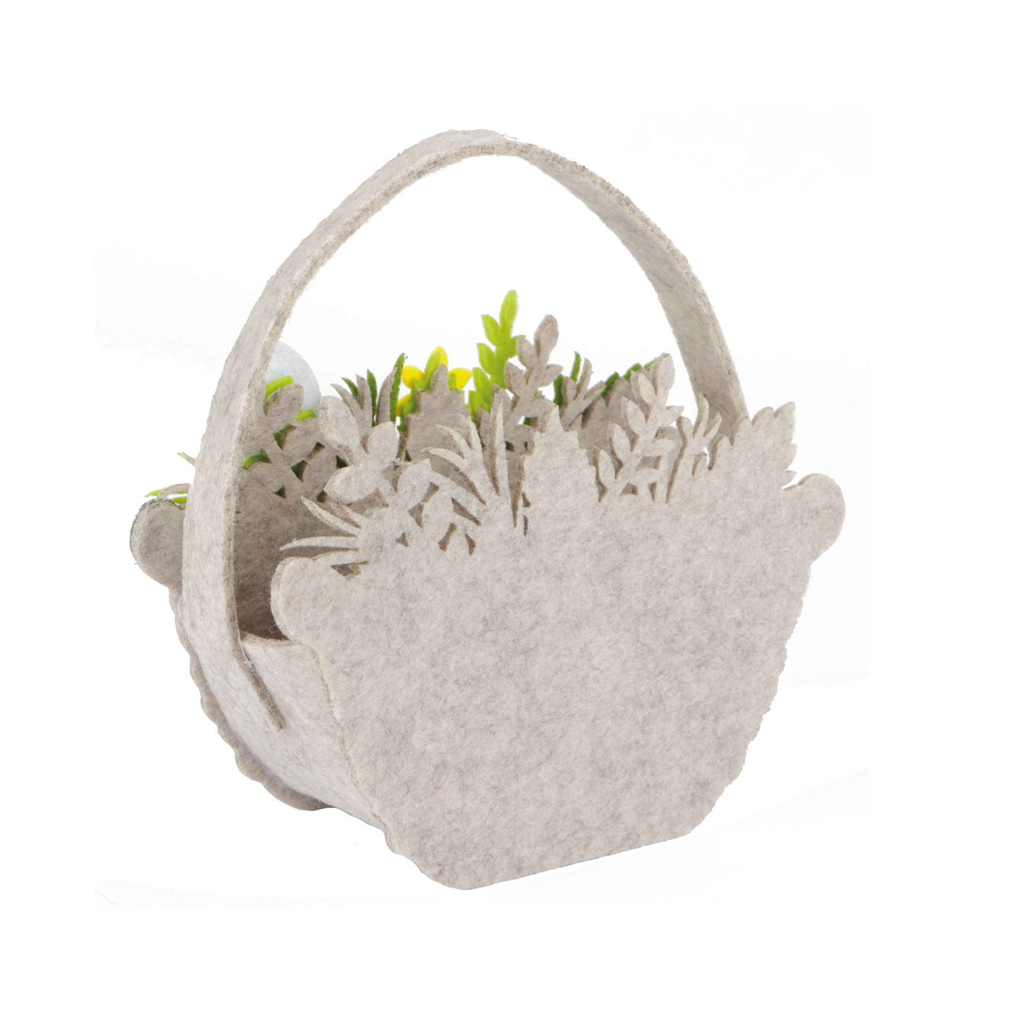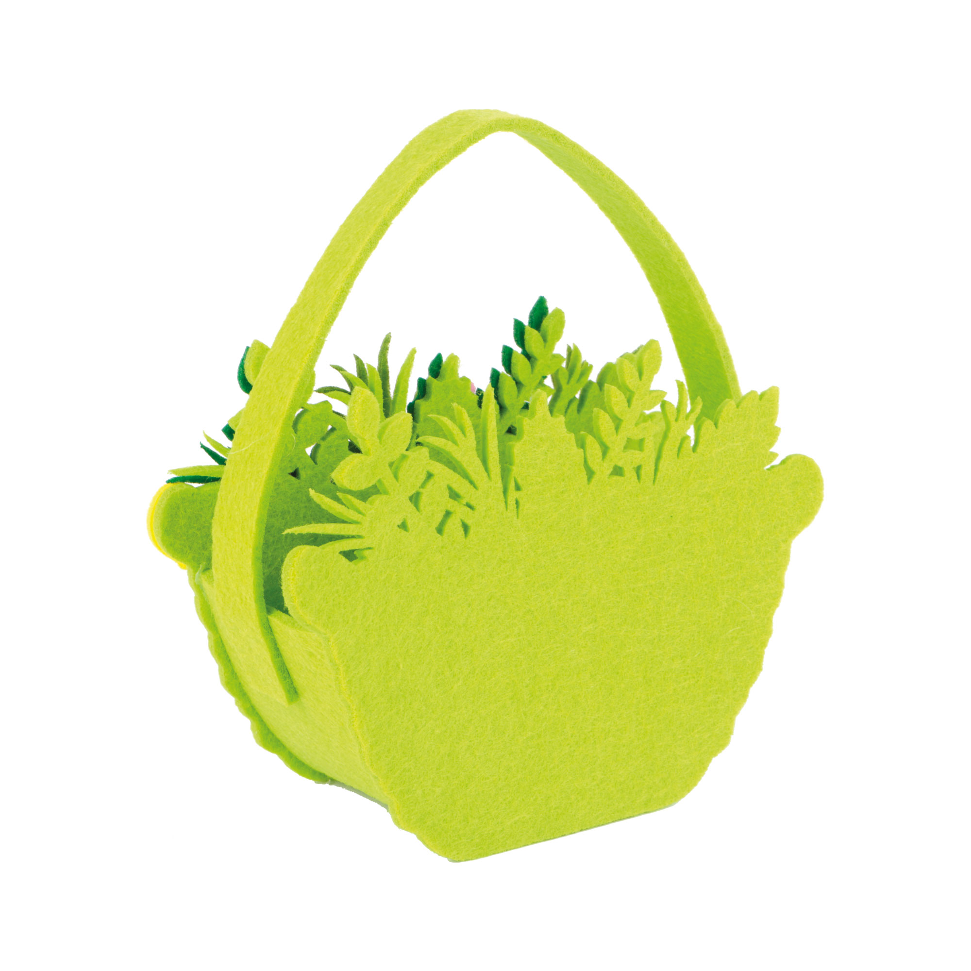 Dit vilten mandje heeft een grasrandje. Heel leuk om een klein voorjaars of zomers pakketje in op te maken.