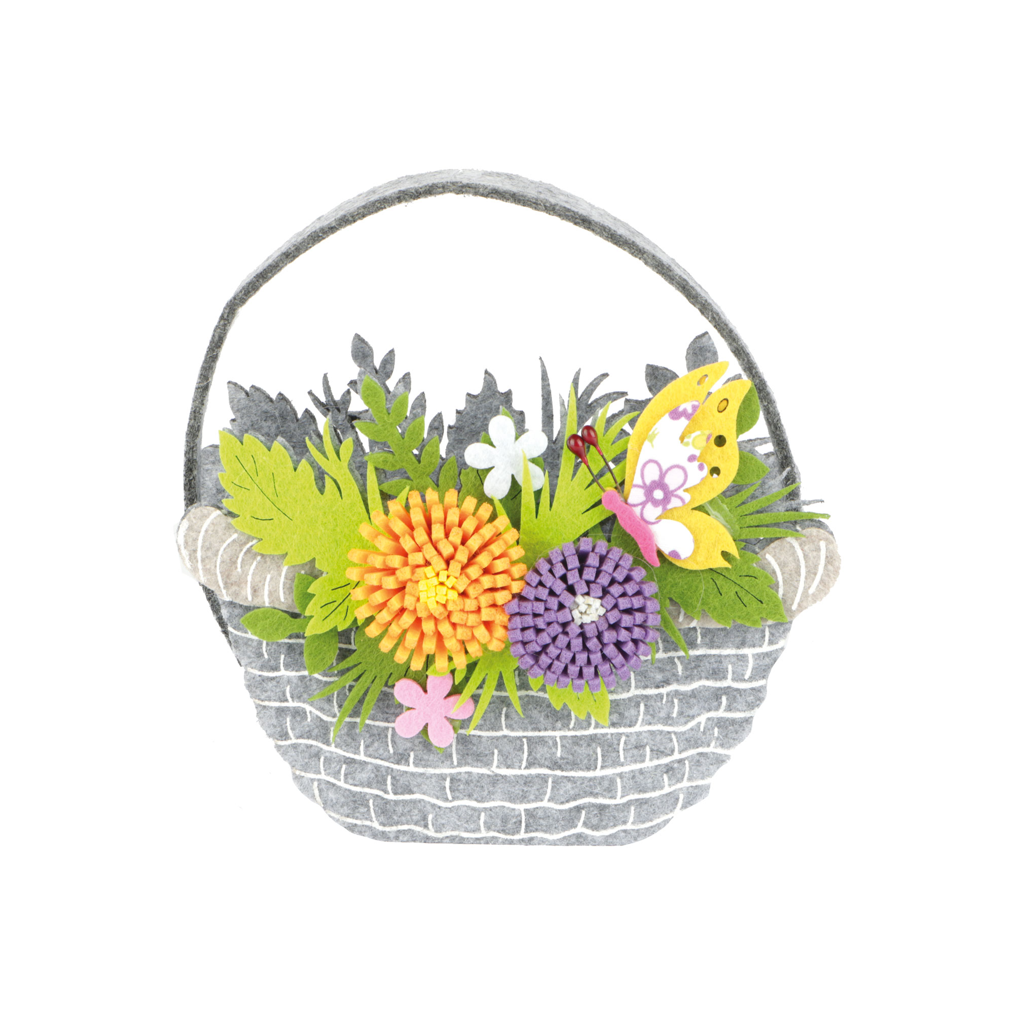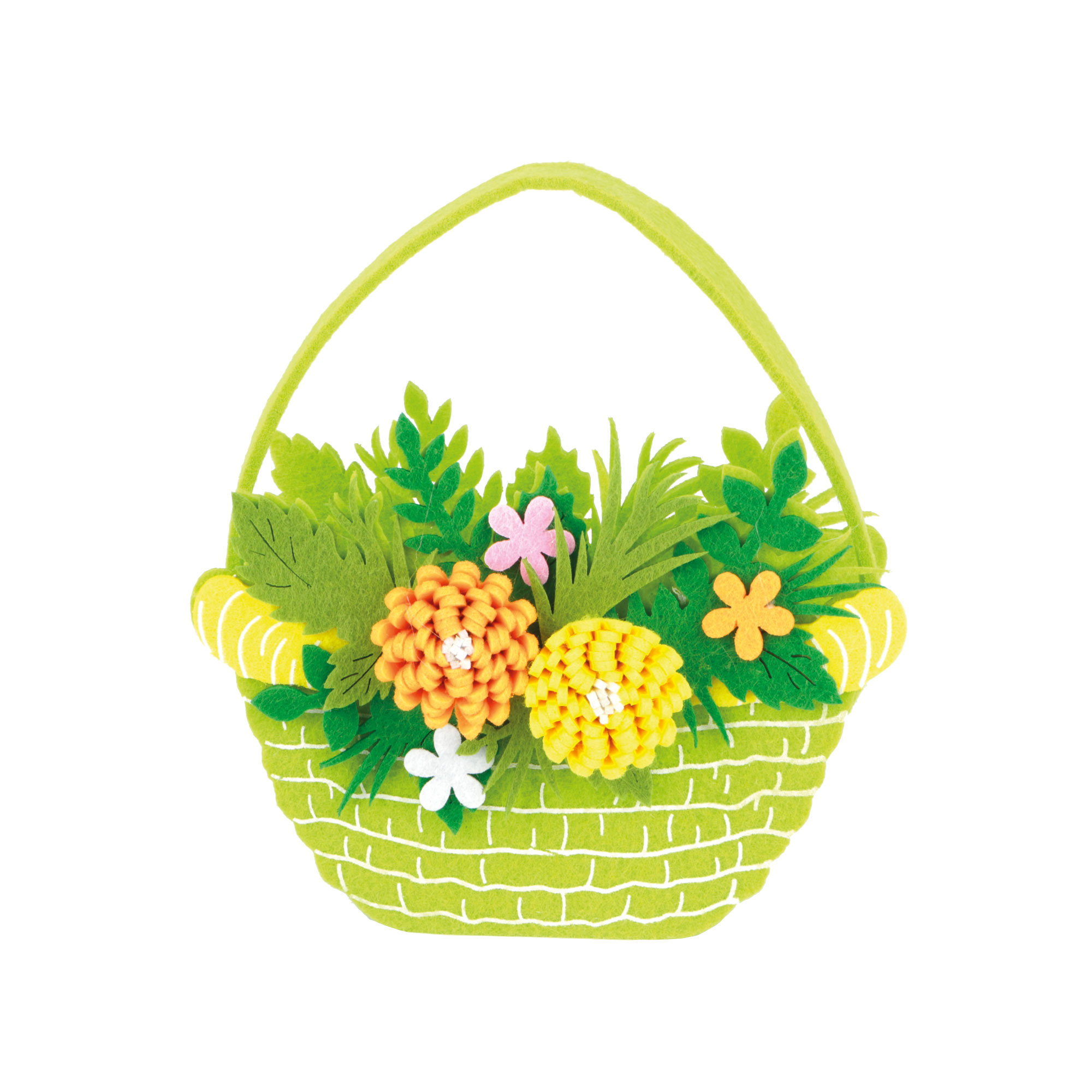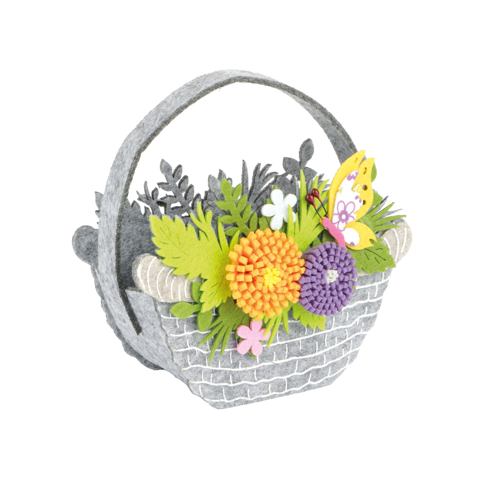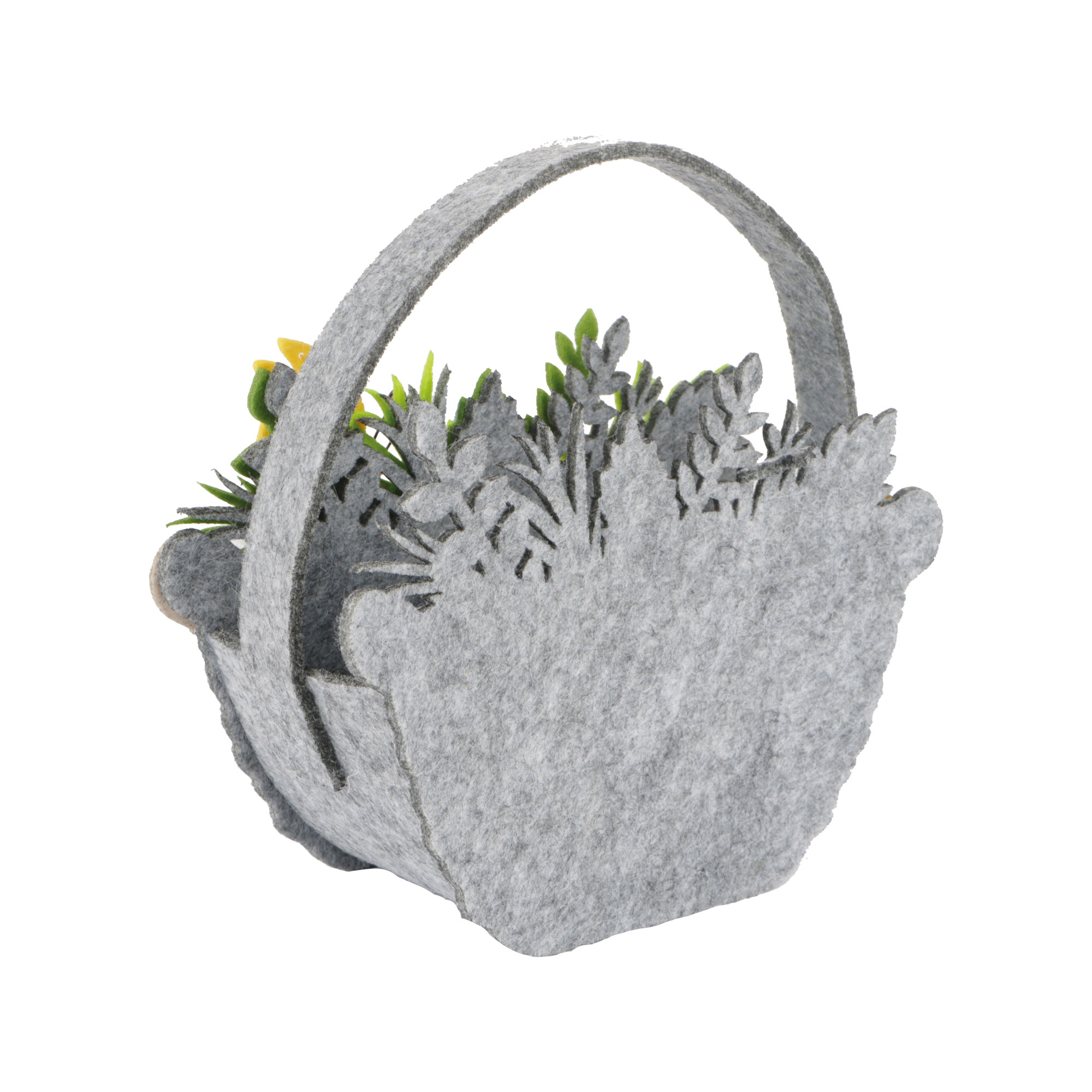 Dit vilten mandje heeft een grasrandje. Heel leuk om een klein voorjaars of zomers pakketje in op te maken.