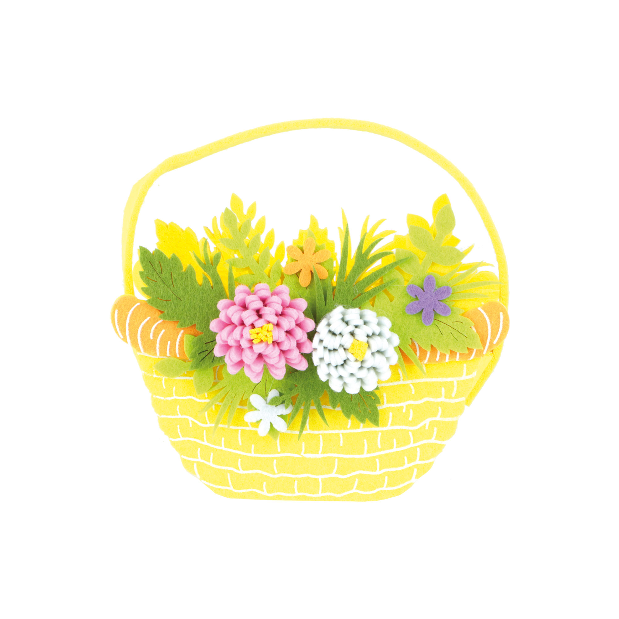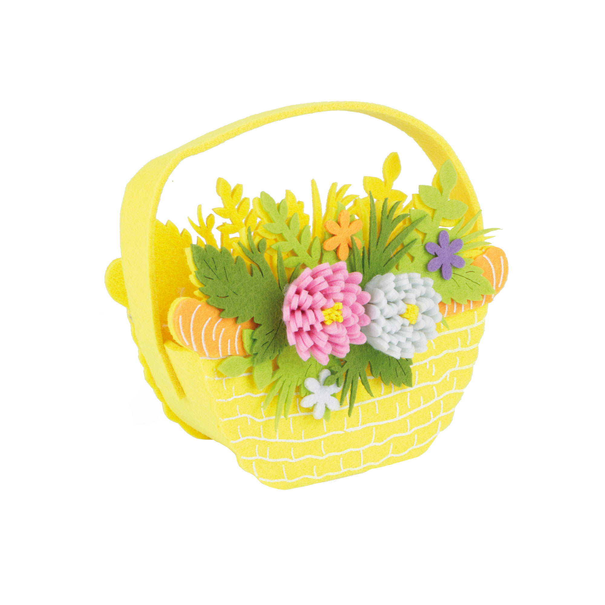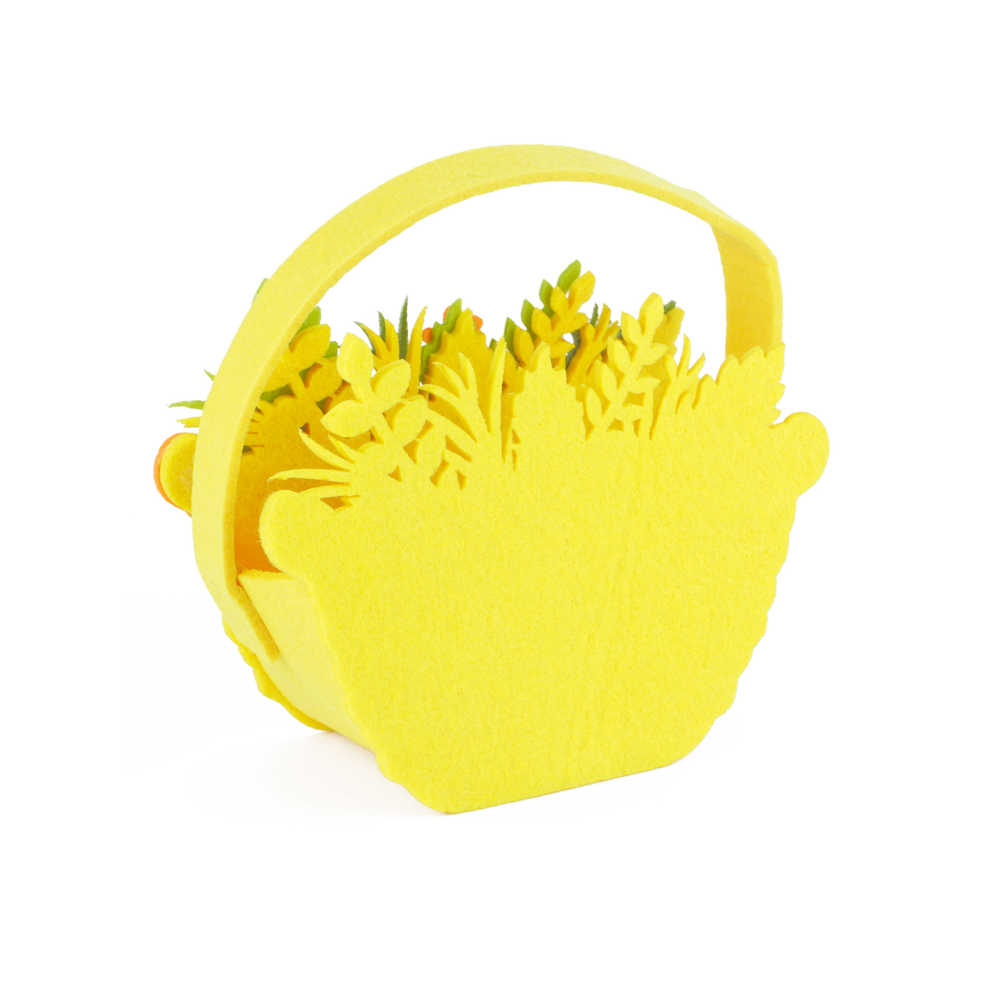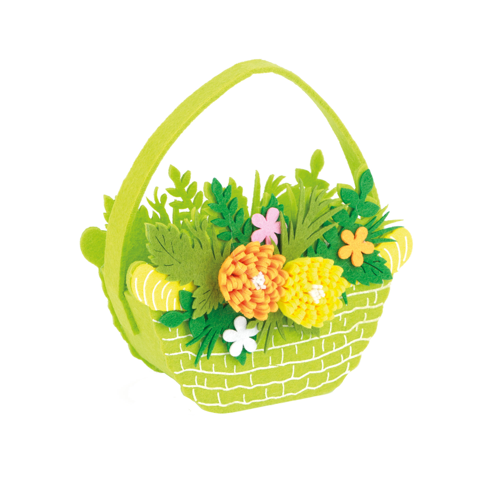 Dit vilten mandje heeft een grasrandje. Heel leuk om een klein voorjaars of zomers pakketje in op te maken.