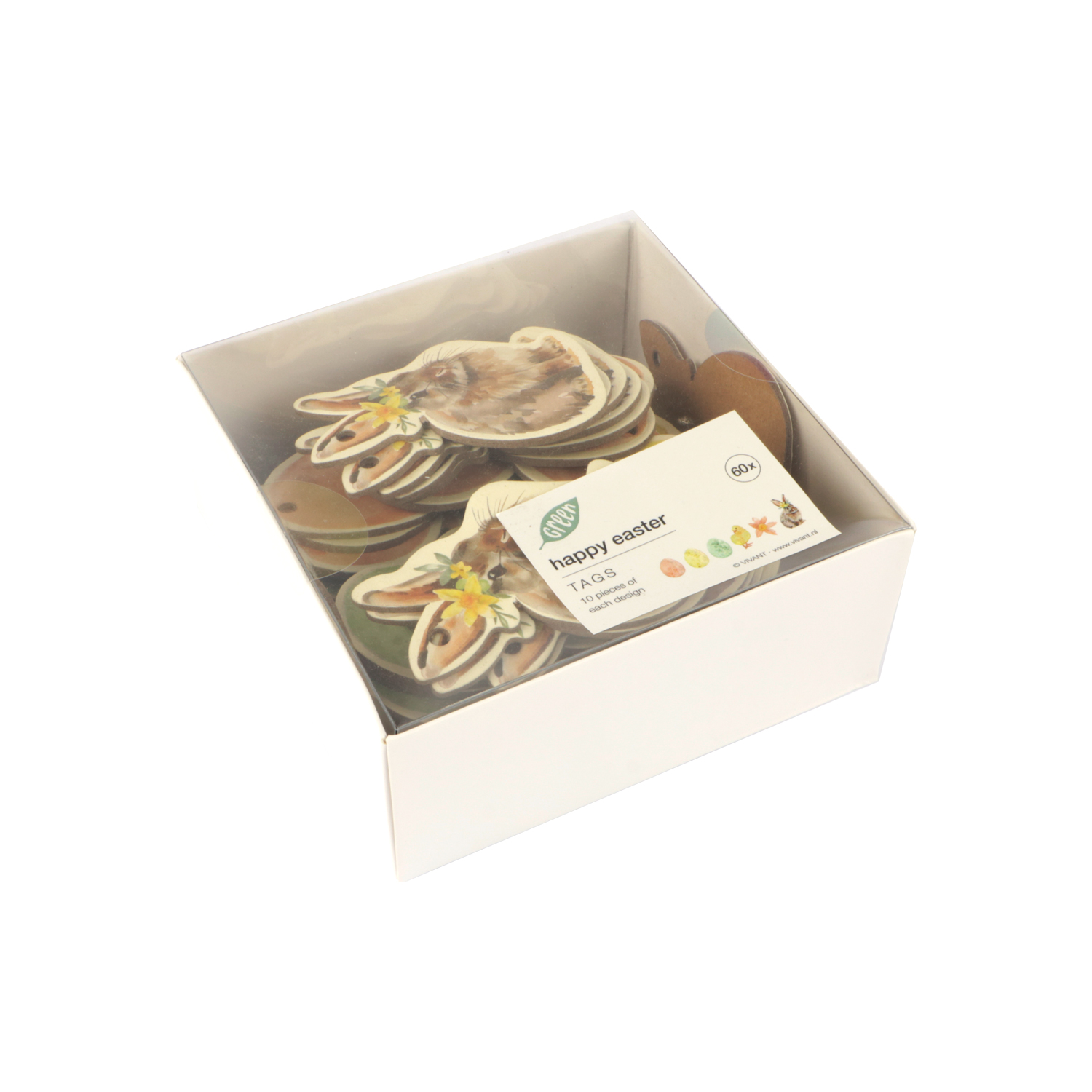 Pak à 60 houten hanger 6x5 cm Happy Easter 6 assorti