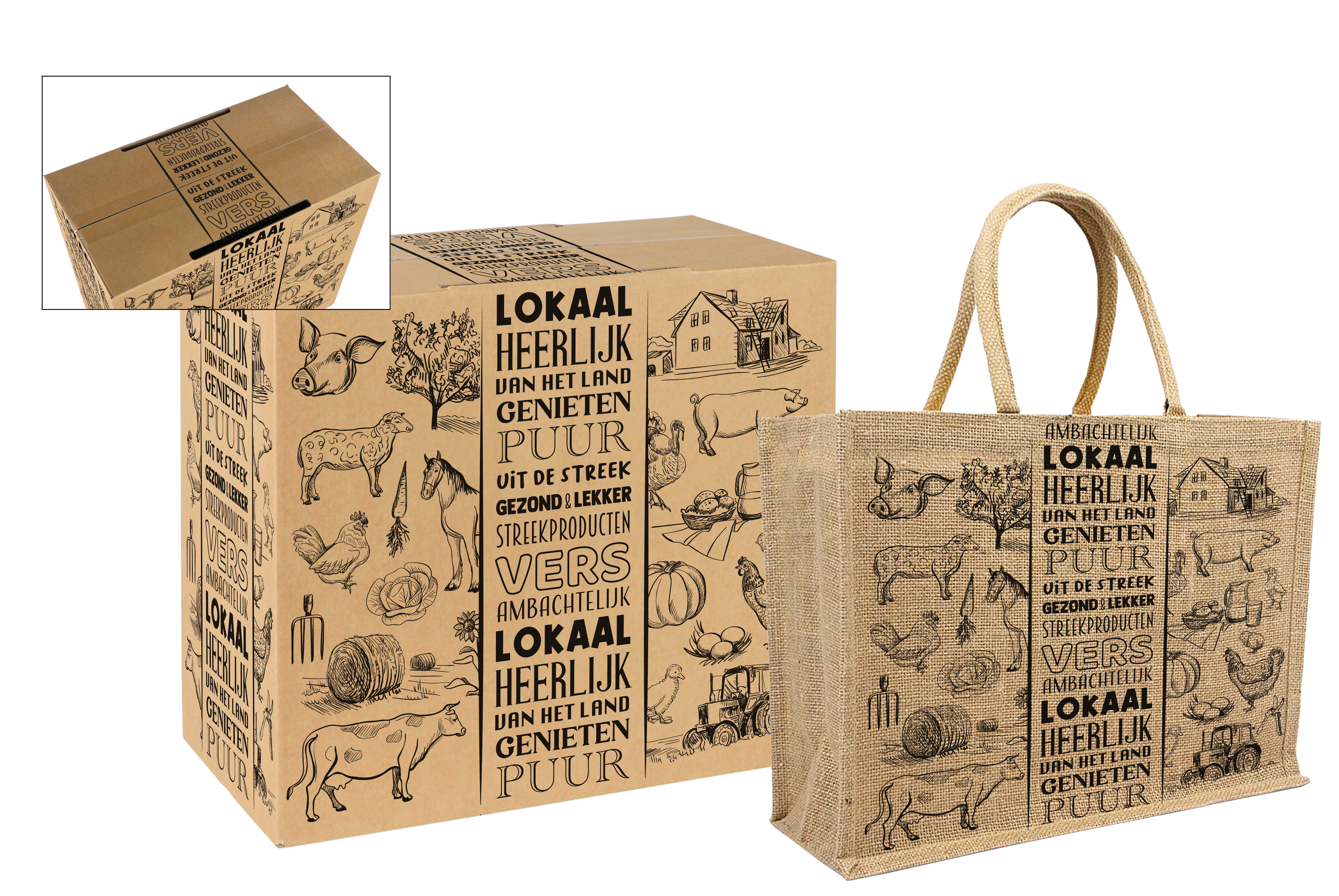 Deze pakketdoos wordt een draagdoos in combinatie met de bijpassende jute tas. De doos is voorzien van openingen waar de hengsels van de tas perfect inpassen. De tas is leverbaar met dezelfde ambachtelijke bedrukking als de doos, maar ook in een onbedrukte uitvoering. Beide tassen vind je bij de gerelateerde artikelen op deze pagina.
